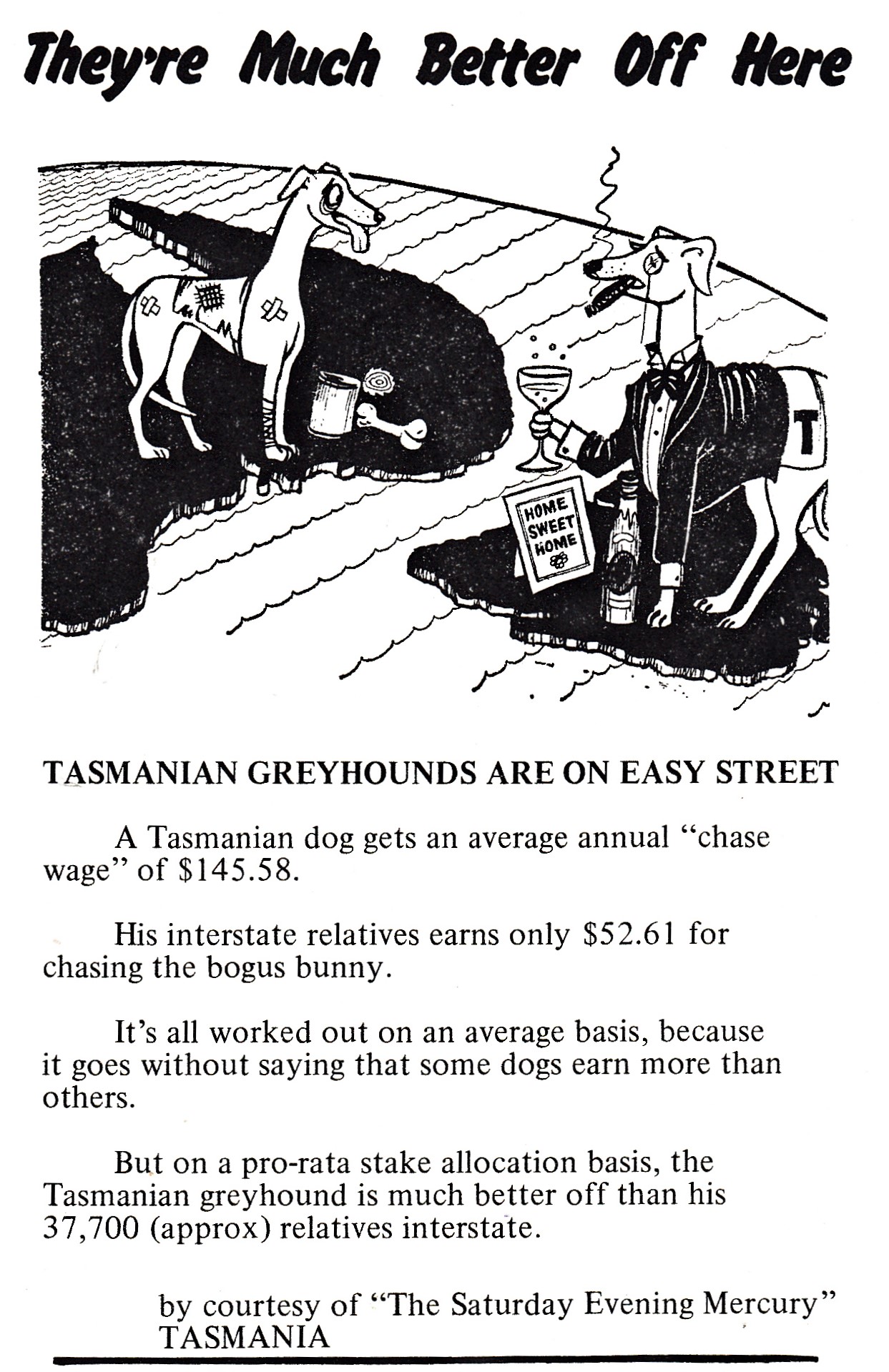 Things have changed in 52 years. Here we see that Tassie was the place to race greyhounds. Interesting number of dogs on the mainland thirty-seven thousand.