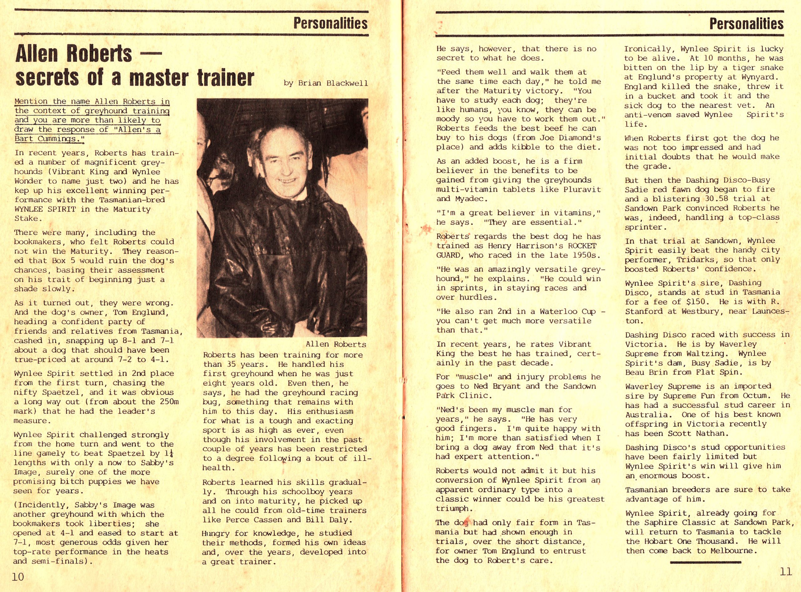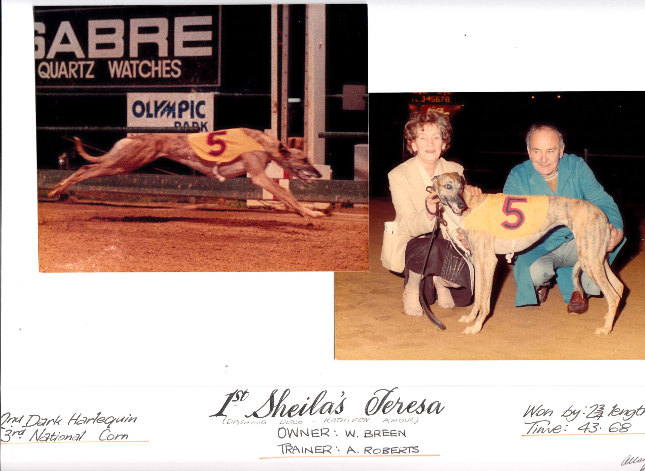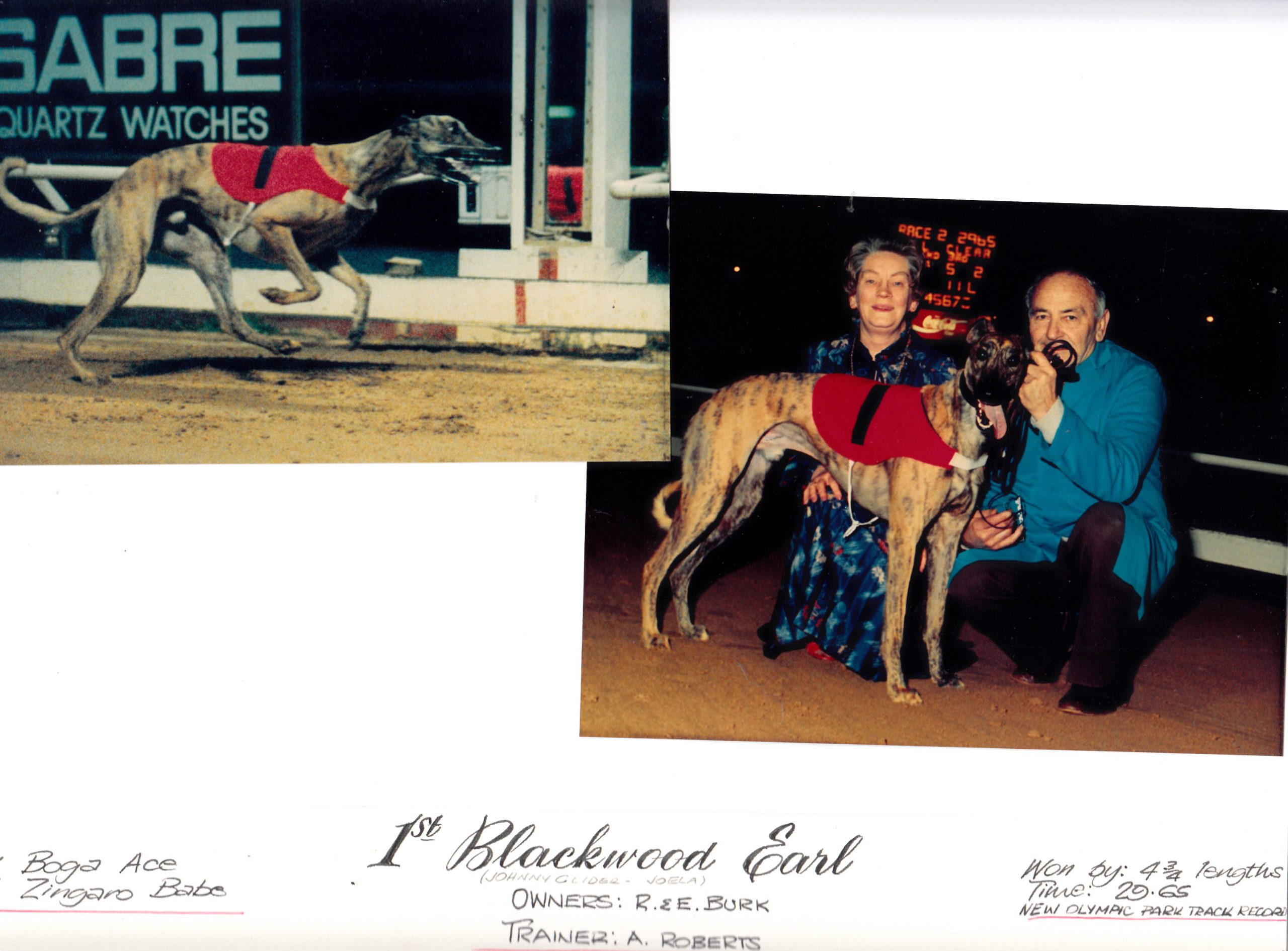 Wayne Robert’s son of Victorian Hall of Fame trainer Allan recently donated many of the family’s artefacts trophy’s, photos, stories after a lifetime of success training Greyhounds at the highest level. A much-loved man Allan together with the members of his family were welcome participants at many meetings throughout the state in a stellar career. Here is interview conducted by Brian Blackwell in his Greyhound Reporter February 1982. Plus, a famous Alan Quinn photo of Old Berry Hermes. He was one of the first English imports to Australia, trained by Allan Old Berry Hermes, later became a highly successful Sire. Allan stood him at stud, and 80 per cent of Allan’s bloodlines emanated through him. The late Allan Roberts put the polish on many champions the ilk of Perky Liz, Shan’s Deb, Glenavon King, Ringwood Lass, Vibrant Lass, Vibrant King, Wynlee Spirit, Wynlee Wonder, Wynlee Raider and Blackwood Earl – to name just a few. He had enormous success with greyhound from Tasmania. His best was 1984 Victorian Greyhound of the Year Sheila’s Teresa. Here is a classic photo of her with a very young-looking Shawn Cosgrove and the late John Russell who we sadly lost last month. Plus action shots of “Sweetie” and the Earl setting new figures at Olympic Park.