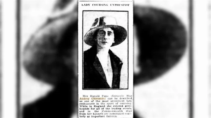 In 1918, Audrey Chirnside married Lieut. Harold Pape, M C of the British Tank Corps, continuing her coursing interests and success whilst married in the United Kingdom. Remaining, a key point of contact for Australian courses looking to improve their greyhounds with foreign pedigrees.