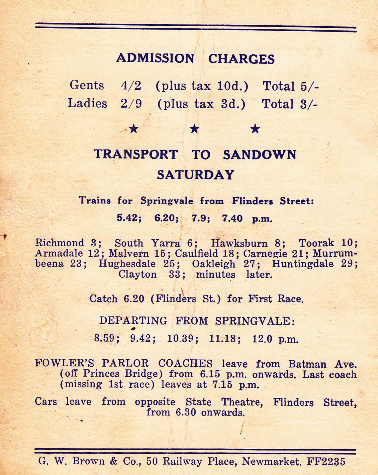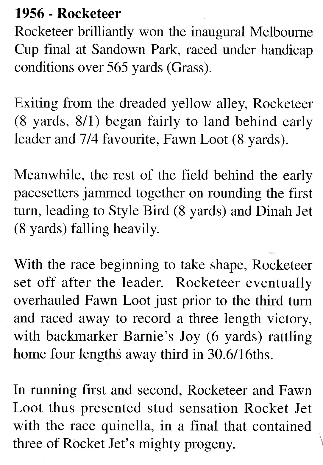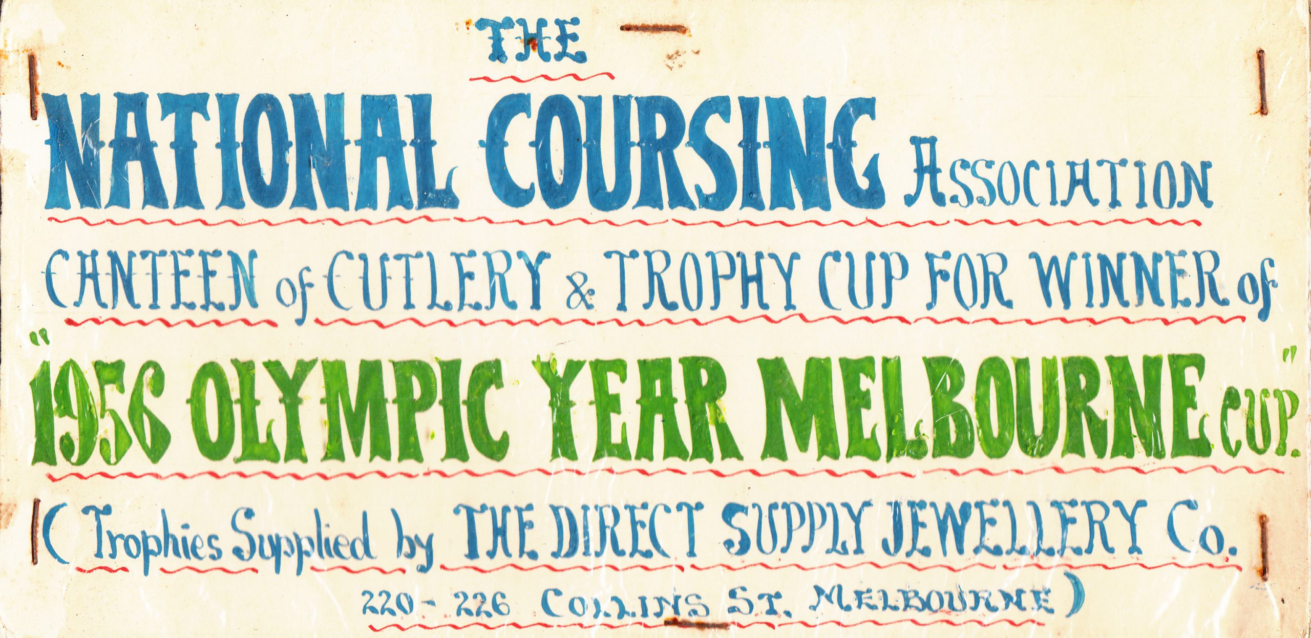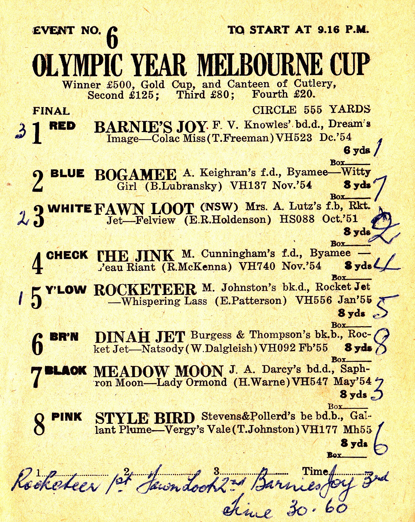 1956 Melbourne Cup winner Rocketeer. Uncovered in a very old safe at Sandown Park is the 1956 Melbourne Cup Racebook. The first running of the Cup in 1956 the Melbourne Olympic year was won by Rocketeer for well-known coursing man the popular Max Johnson. Trained by E Patterson from Monageeta a tiny town 54 k’s North of Melbourne between Sunbury and Romsey in fertile agricultural land east of the Macedon Ranges. To this day we have not been able to find out what Mr Patterson’s first name is Eddie, Ernie we don’t know. Perhaps Doug Scott or Johnny Reid can help? You will notice the box draw was done on course on arrival at the meeting. The Black Dog by Rocket Jet drew 5 and wore the yellow rug. He had been runner-up to make the Cup behind The Jink a 2/1 on shot in 31.22 the margin was a 1/2 length and he started 7/1. It was the fastest of the four semis held on November 17th. Rocketeer beat Fawn Loot and Barnie’s Joy in 30.60 in the final. The race was run under Handicap conditions the field all started from 8 yards except for Barney’s Joy he started from 6 yards. The race was run on Grass over the 555 yards. I have included the race description from Paul Munt’s book the The Australian Greyhound. Also found was the Sign displayed in front of the Trophy a Canteen of Cutlery. A couple of things I loved from the book is the Club’s telephone number UJ9230 and the mail address P.O. Box 13 Springvale. It is same address to this very day.