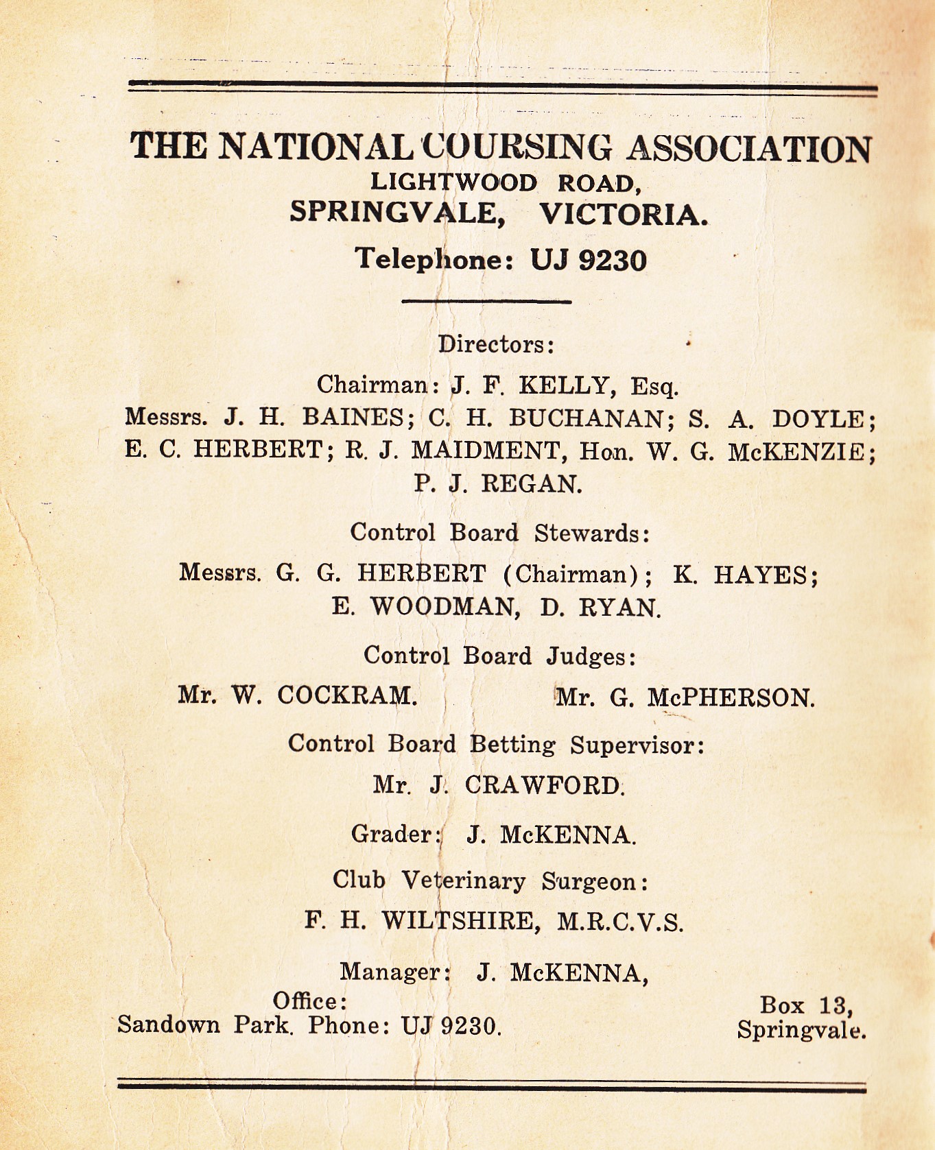 1956 Melbourne Cup winner Rocketeer. Uncovered in a very old safe at Sandown Park is the 1956 Melbourne Cup Racebook. The first running of the Cup in 1956 the Melbourne Olympic year was won by Rocketeer for well-known coursing man the popular Max Johnson. Trained by E Patterson from Monageeta a tiny town 54 k’s North of Melbourne between Sunbury and Romsey in fertile agricultural land east of the Macedon Ranges. To this day we have not been able to find out what Mr Patterson’s first name is Eddie, Ernie we don’t know. Perhaps Doug Scott or Johnny Reid can help? You will notice the box draw was done on course on arrival at the meeting. The Black Dog by Rocket Jet drew 5 and wore the yellow rug. He had been runner-up to make the Cup behind The Jink a 2/1 on shot in 31.22 the margin was a 1/2 length and he started 7/1. It was the fastest of the four semis held on November 17th. Rocketeer beat Fawn Loot and Barnie’s Joy in 30.60 in the final. The race was run under Handicap conditions the field all started from 8 yards except for Barney’s Joy he started from 6 yards. The race was run on Grass over the 555 yards. I have included the race description from Paul Munt’s book the The Australian Greyhound. Also found was the Sign displayed in front of the Trophy a Canteen of Cutlery. A couple of things I loved from the book is the Club’s telephone number UJ9230 and the mail address P.O. Box 13 Springvale. It is same address to this very day.
