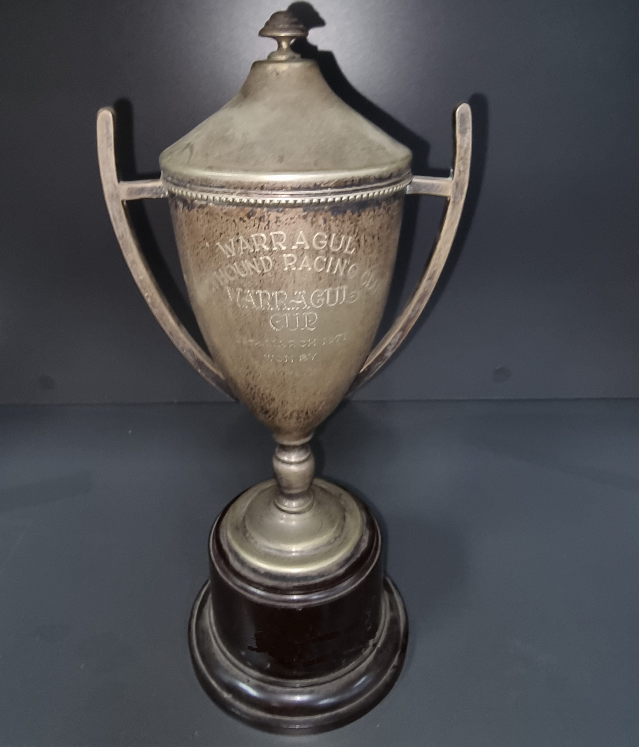 The Warragul Cup of 1971 held in March of that year was won by Red Velore (Little Error x Kadia) bred by legendary owner-trained-breeder Joe Hull. The inventor of the Hydro Bath. Owned and trained by Fred Knee the race over 540 yards saw Red Valore win by a nose with the same margin between second and third. Miss Juvenile finished second and Yinnar Lass third in 28 and 14/16ths. A handy sprinter he won a number of races around Victoria including Sandown and Olympic Park. Like the Waterloo Cup this trophy was found by accident in Croydon.