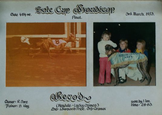 Des Dooley posted -1973 Sale Cup winner Rerod – trainer Don Hays 2nd Sale Cup. Rerods mother Lucky Chimes was a litter sister to Mini Note (dam of Half Your Luck) and Mini Chimes (mother of Nigger Chimes) From the Armatree Prince – Flash Note litter bred by Nugget Charles from South Gippsland.