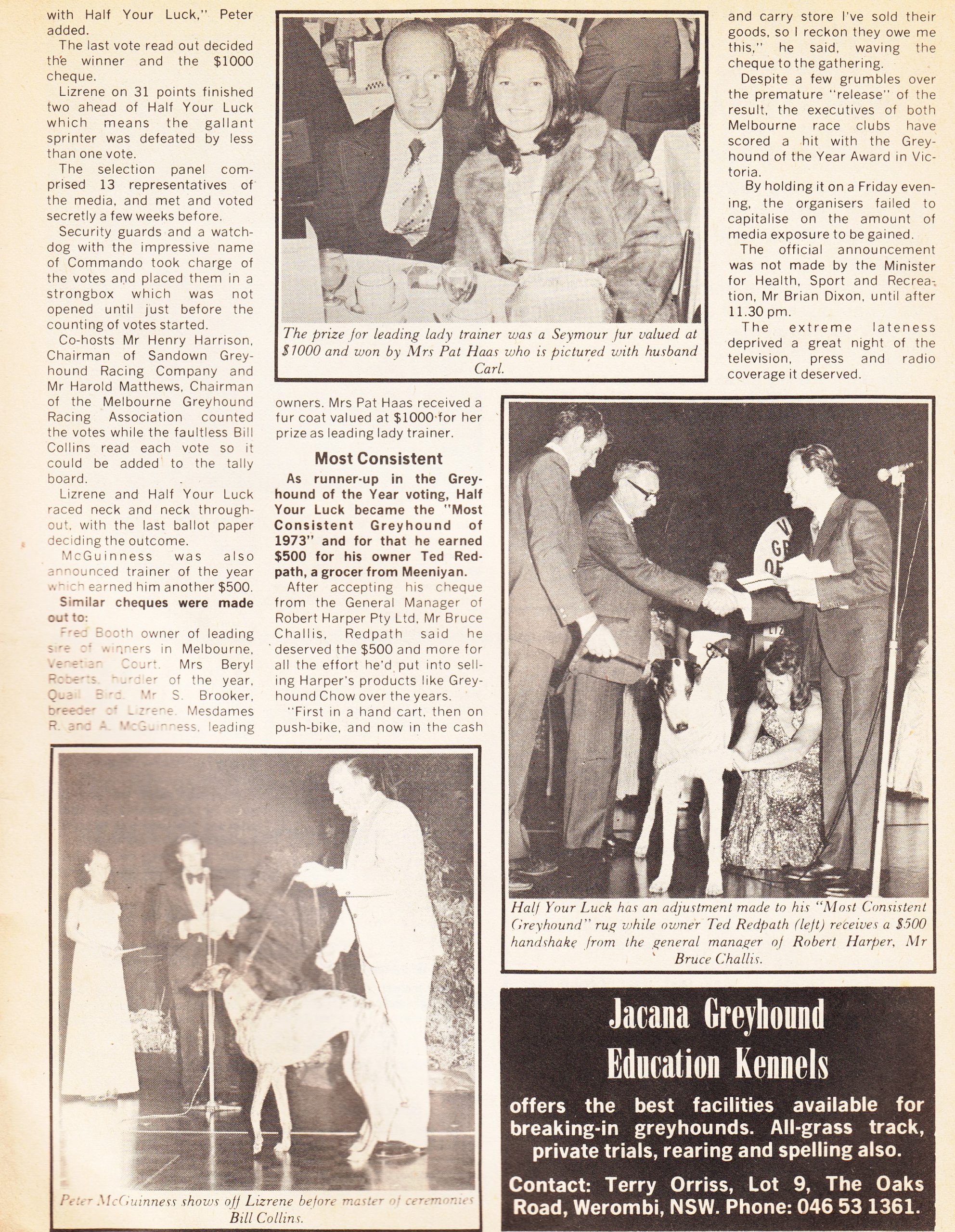 1973 was the first function for the Victorian Greyhound of the Year. It was held at the Camberwell Civic Centre in inner Melbourne. I was 17 and attended with my mate Kevin Smith. We weren’t invited but you could sit in the balcony and watch. However, because we were the only two there we were asked to come and sit in a couple of spare seats on a back table. Drinks and food we had great night. Bonus one of my all-time favourite dogs won Lizrene. Bill Collins host and Dennis Walter sang and hosted at my suggestion 25 years later.