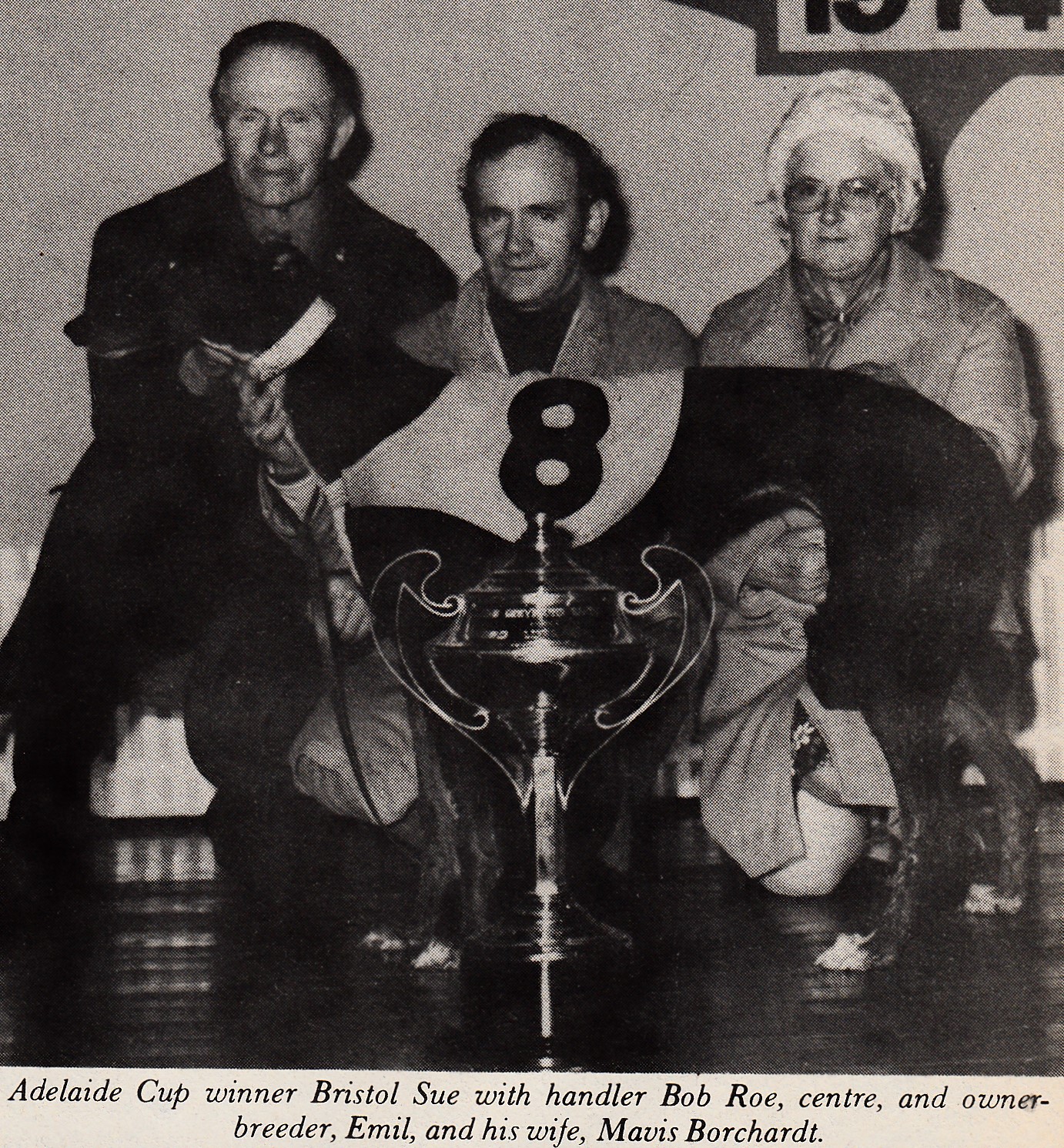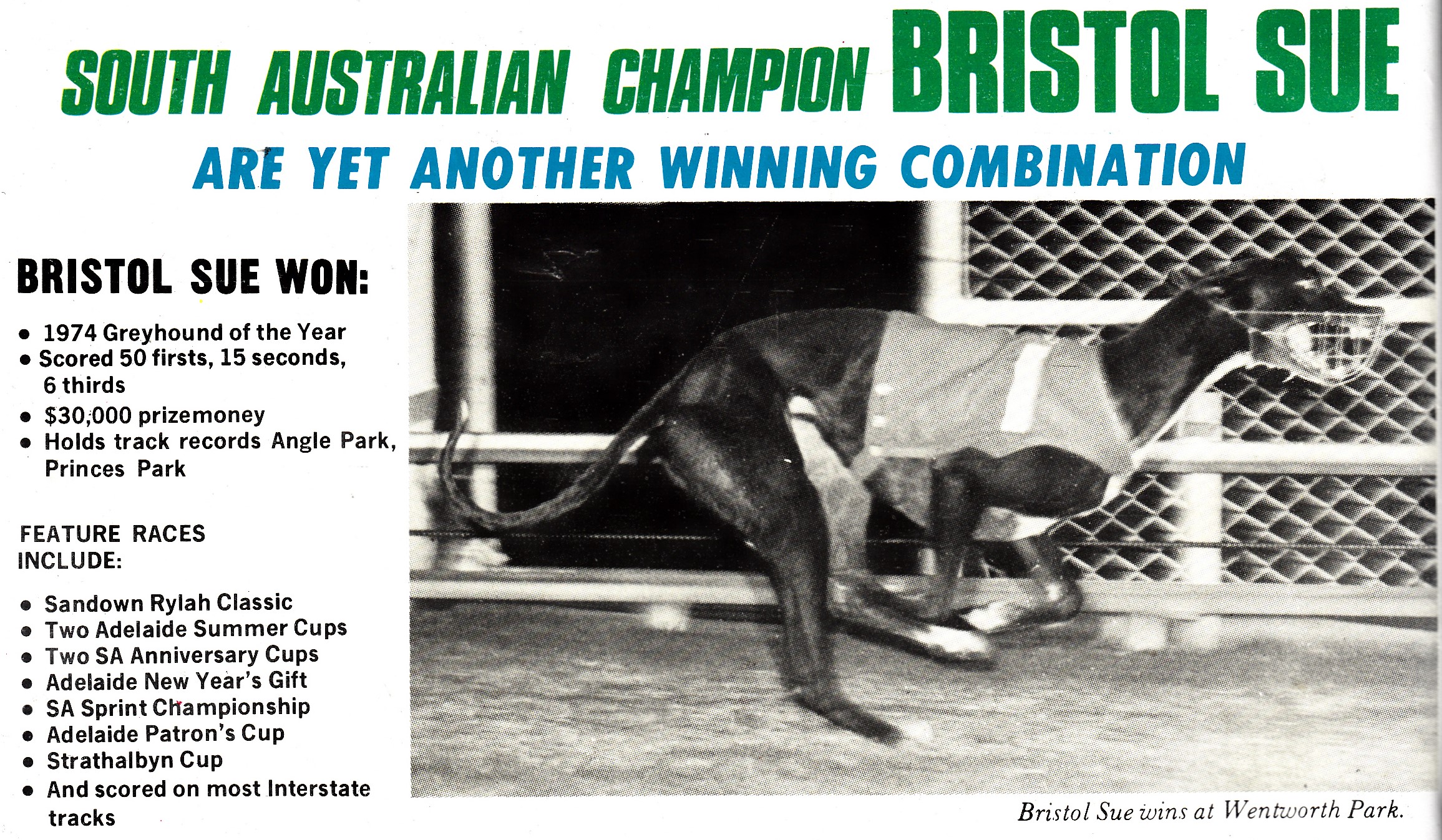 1974 Adelaide Cup winner Bristol Sue what champ she was won 50 races and set track records. Trained by Hall Of Famer “The Meadows Maestro” Doug Payne he told me in an interview in the middle 90s he thought she was at that stage the best dog to ever race in South Australia. She probably still is.