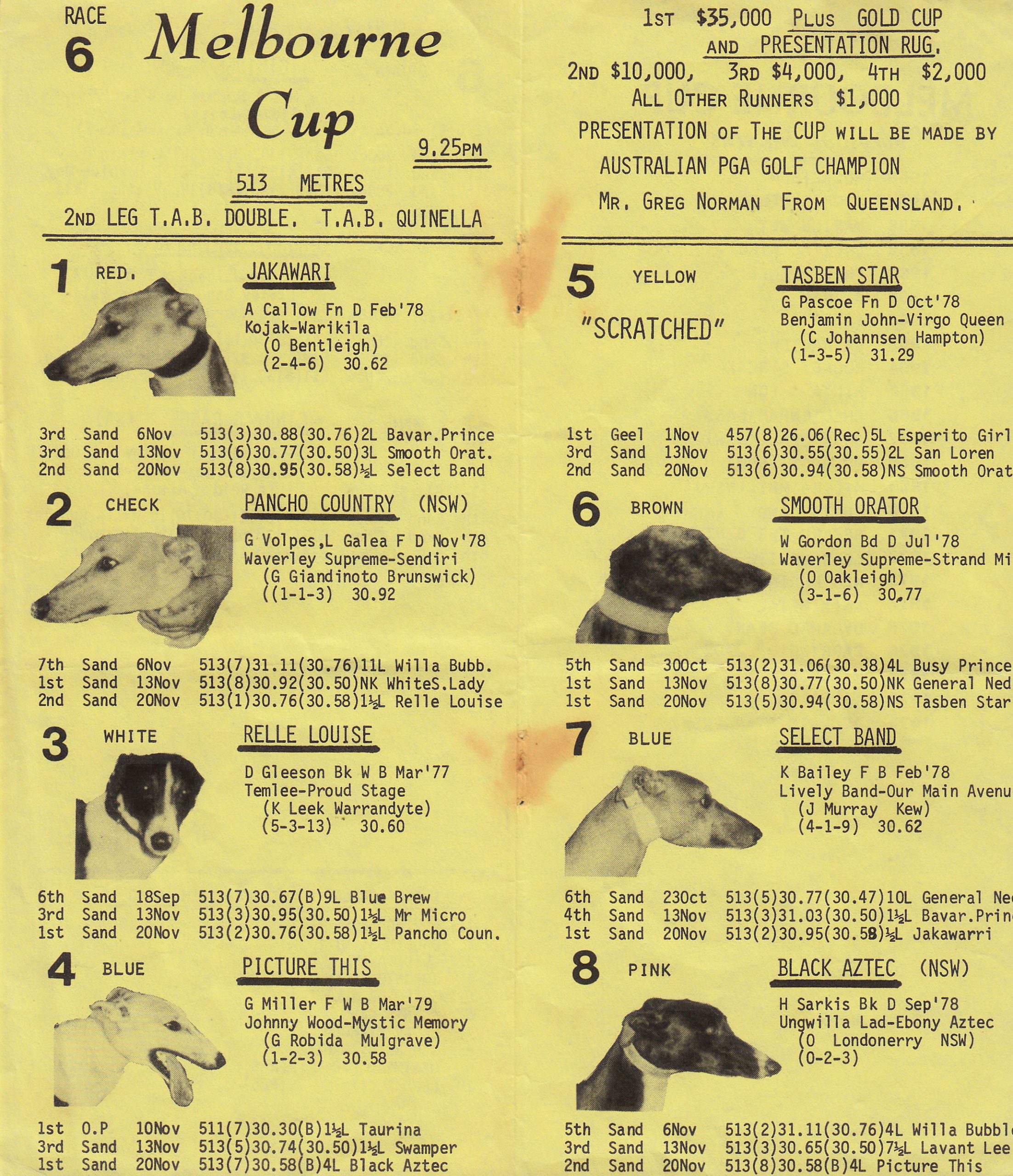 Great field for the 1980 Melbourne Cup things have changed in 40 years. Final won by Black Aztec from Pancho Country and Smooth Orator. A neck by a half-length in 30.74 for the 513 metres. Greg Norman got a “monkey” cash for the appearance.