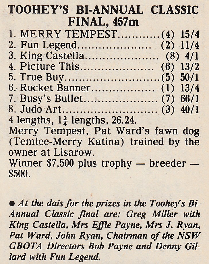 Jeff Collerson– Merry Tempest was trained by Pat Ward, a terrific trainer from Lisarow on the central coast. His dogs were nearly always brilliant beginners like Hallowed who won the Tweed Heads Galaxy in 1984, Harold Park flyer Regal Baron, the enigatic Metal Springs and 1988 Richmond Derby winner Maggiore