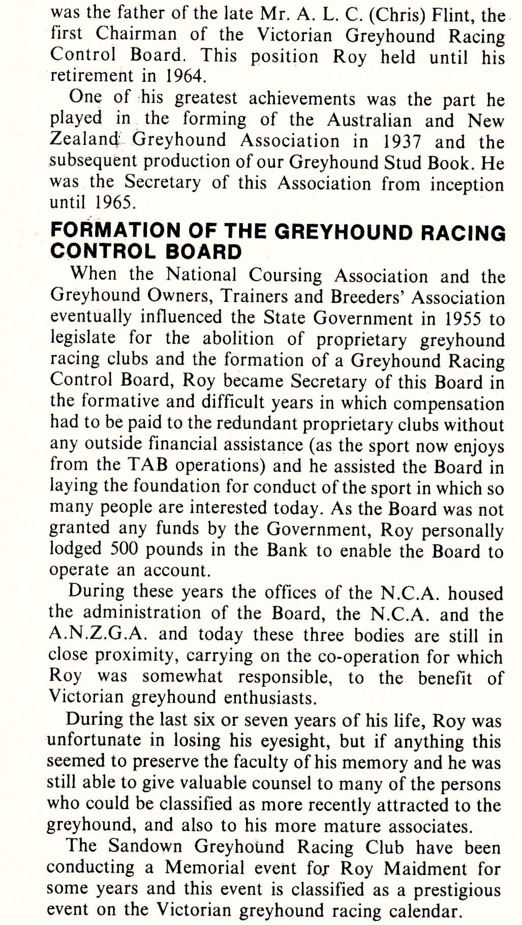 The 1983 Maidment Memorial won by The Gallows an astute purchase from Queensland by the El Gari Lodge Syndicate. Trainer John Hartley. Nice tribute to Roy Maidment for anyone wondering what his contribution was to Greyhound Racing. Some iconic names in the presentation shot.
