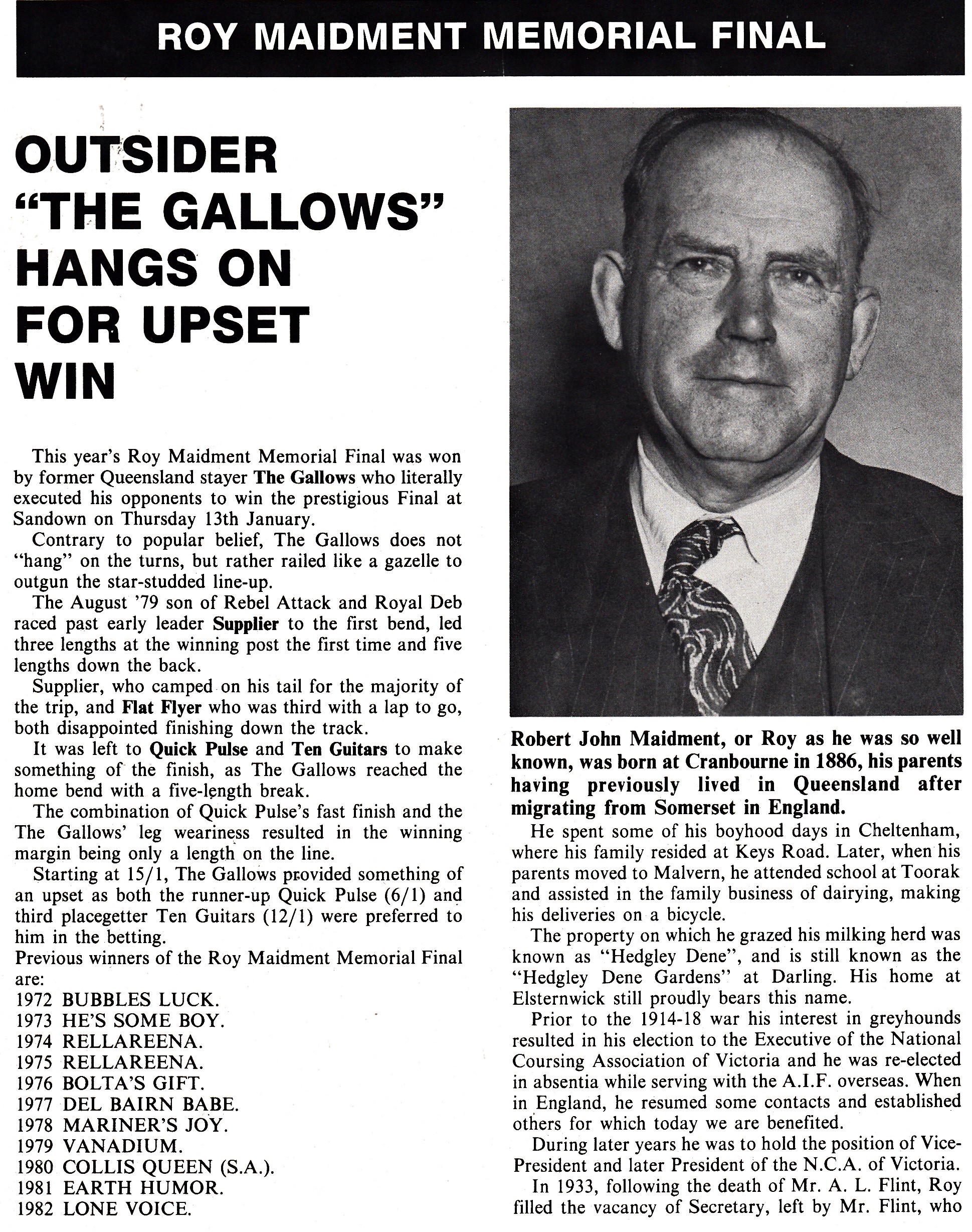 The 1983 Maidment Memorial won by The Gallows an astute purchase from Queensland by the El Gari Lodge Syndicate. Trainer John Hartley. Nice tribute to Roy Maidment for anyone wondering what his contribution was to Greyhound Racing. Some iconic names in the presentation shot.