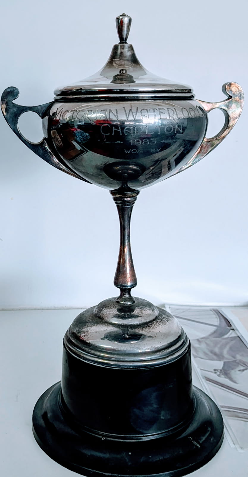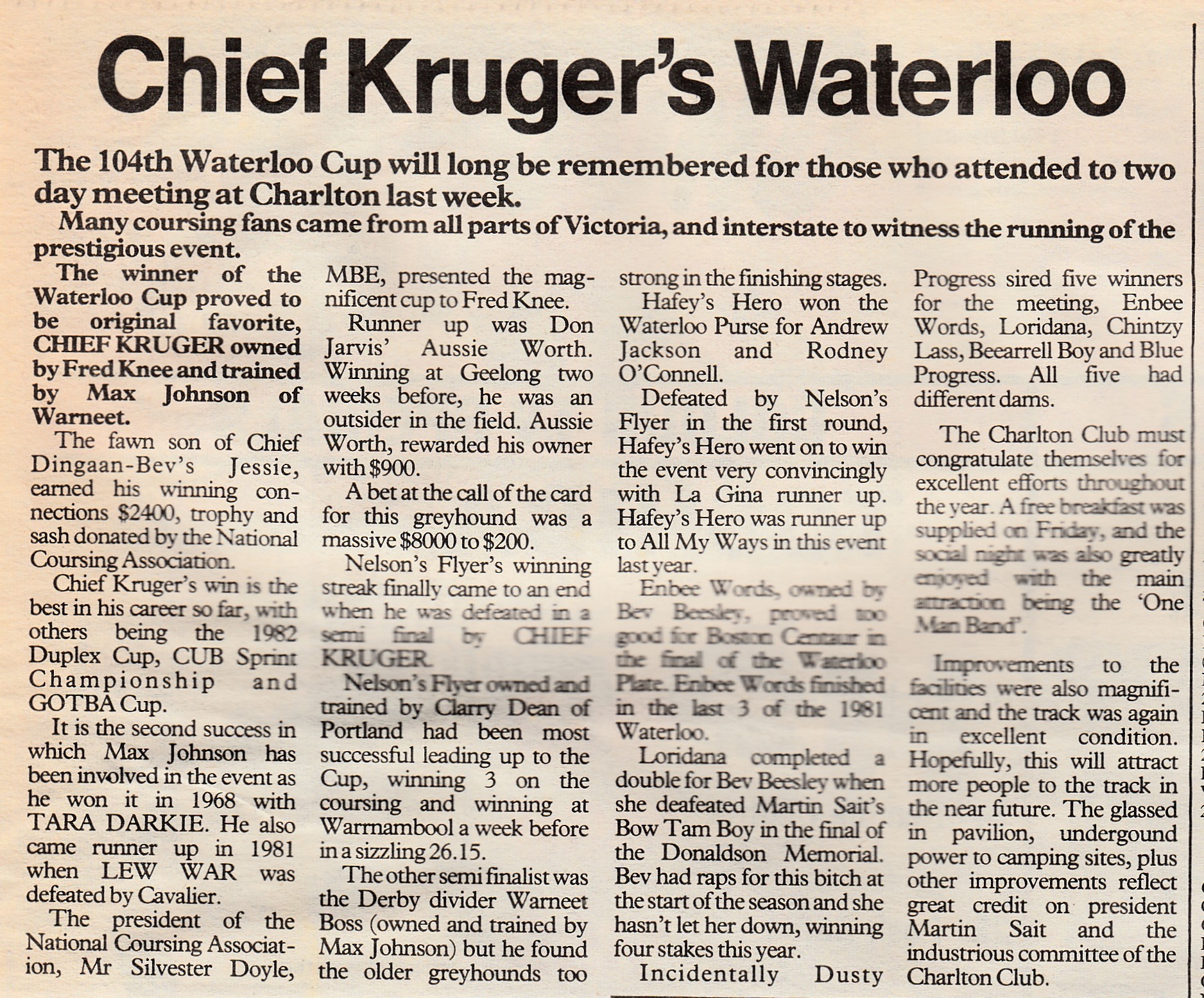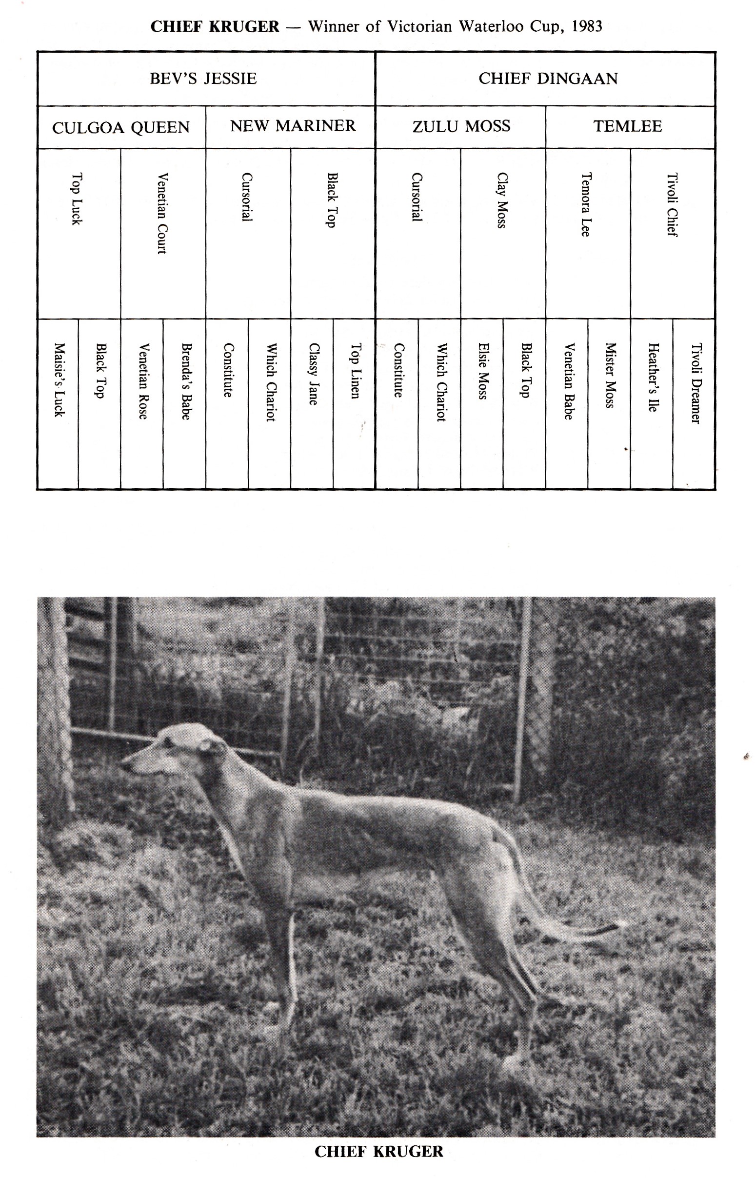 1983 Waterloo Cup winner Chief Kruger raced by Fred Knee and trained by the great Max Johnson who started putting the polish on Chief Kruger in June of 83. Fred brought Chief Kruger and his litter sister Jessie Dingaan as pups from their breeders the Kruger family. By super race dog Chief Dingaan from Bev’s Jessie they were June 1980 whelps. Held at Charlton the Cup consisted of 52 all aged coursing performers. Chief Kruger beat the well performed Nelson’s Flyer in the semi-final then was too good for Aussie Worth bred raced and trained by veteran greyhound man Donnie Javis. The Trophy was donated to Museum when found by accident in Croydon. Photos include the late Fred Knee with Trophy and Chief Kruger in his yard at home.
