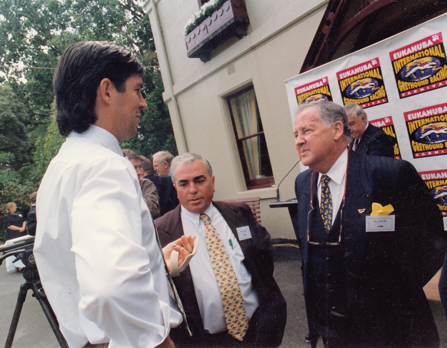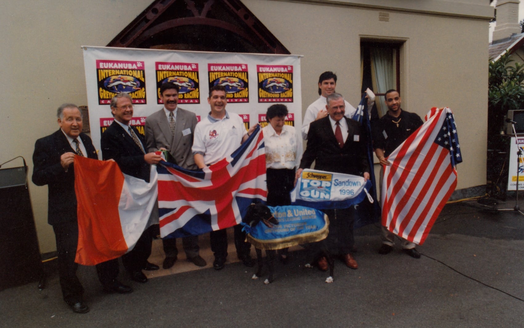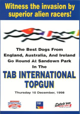 Here is a poster promoting the 1998 International Top Gun. We had the launch in the city at some gardens I can’t remember. Eddie might recall where it was. Here he is never far from his main man “Sticks” Kernahan injured at the time. GRCB Marketing Man Teddy Ryan keeping everything under control. Great pic of the late Bill Collins and Tom Reynolds Sports Minster back then who we sadly lost last week, great man Tom. Also pictured is Melbourne star Irishman Sean Wight. Plus, George Rose and his wife with 1996 Top Gun winner Wylie Boy. The great Rapid Journey won the Gun that year.