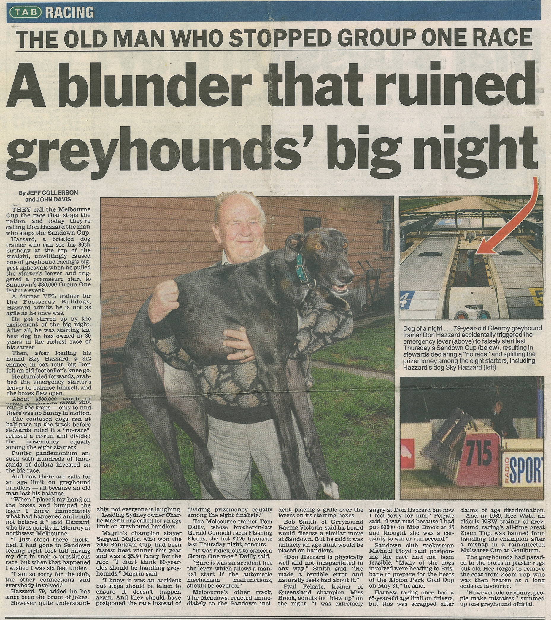 The Sandown Cup is on next month and I found this story from the Sydney Daily Telegraph written by Jeff Collerson and John Davis. I recall doing the “Catching Pen” on the Sunday with the unpresented Cup on the desk and the show opening to “Who Let The Dogs Out” by the Baha Men. My only disappointment as a club director at the time was it was not re-run the next week. It didn’t clash with the Albion Park Gold Cup heats which were run on May 31st. The Cup was on May 17th. We still have the Trophy on display upstairs at Sandown. The website coverage below covers all the action.