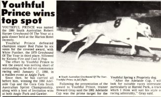 Here is one of Howard Gray’s many stars 1980 SA Greyhound of the Year Youthful Prince.