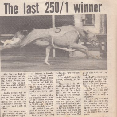Jeff Collerson remarked – A bitch called Secret Sight won over 720m at WP one night at 200/1 she was trained and owned by the late Merv Black a butcher from the inner west Syd suburb of Balmain.