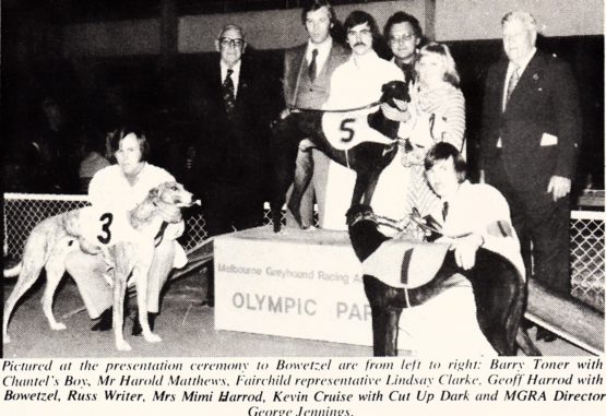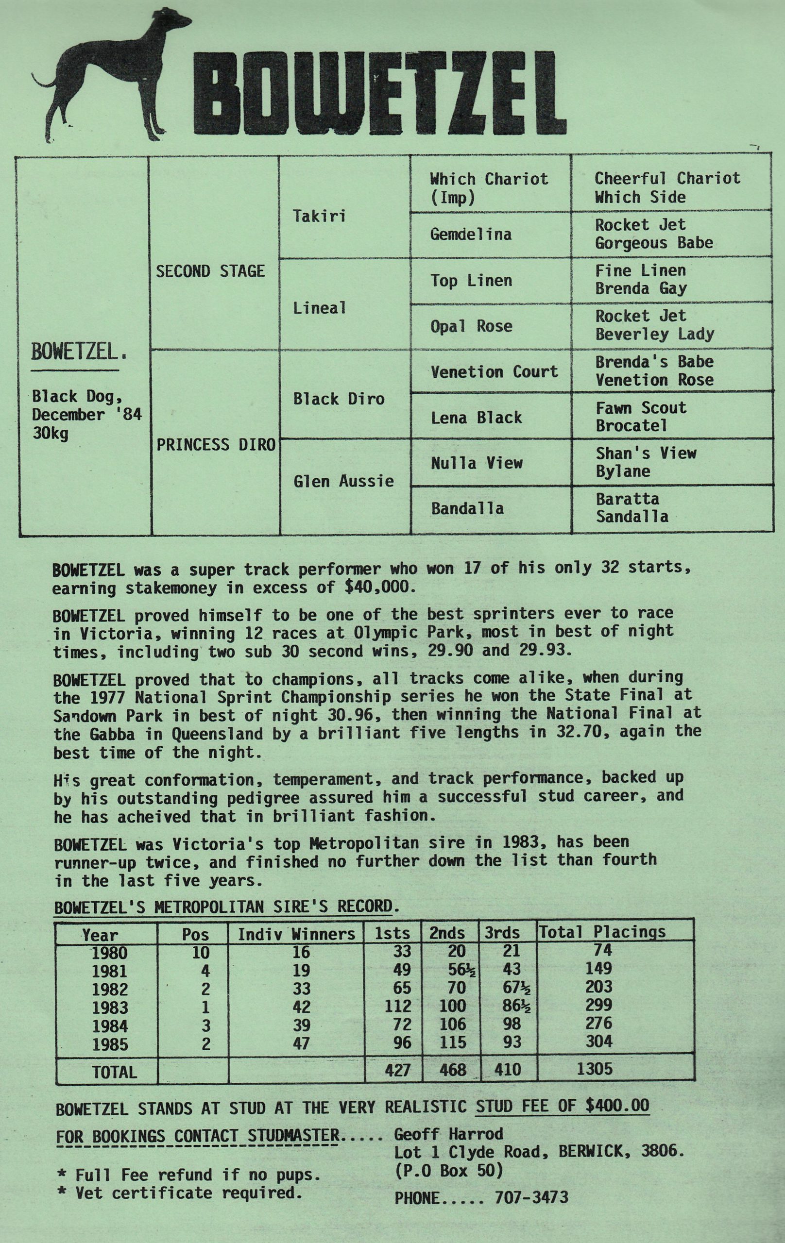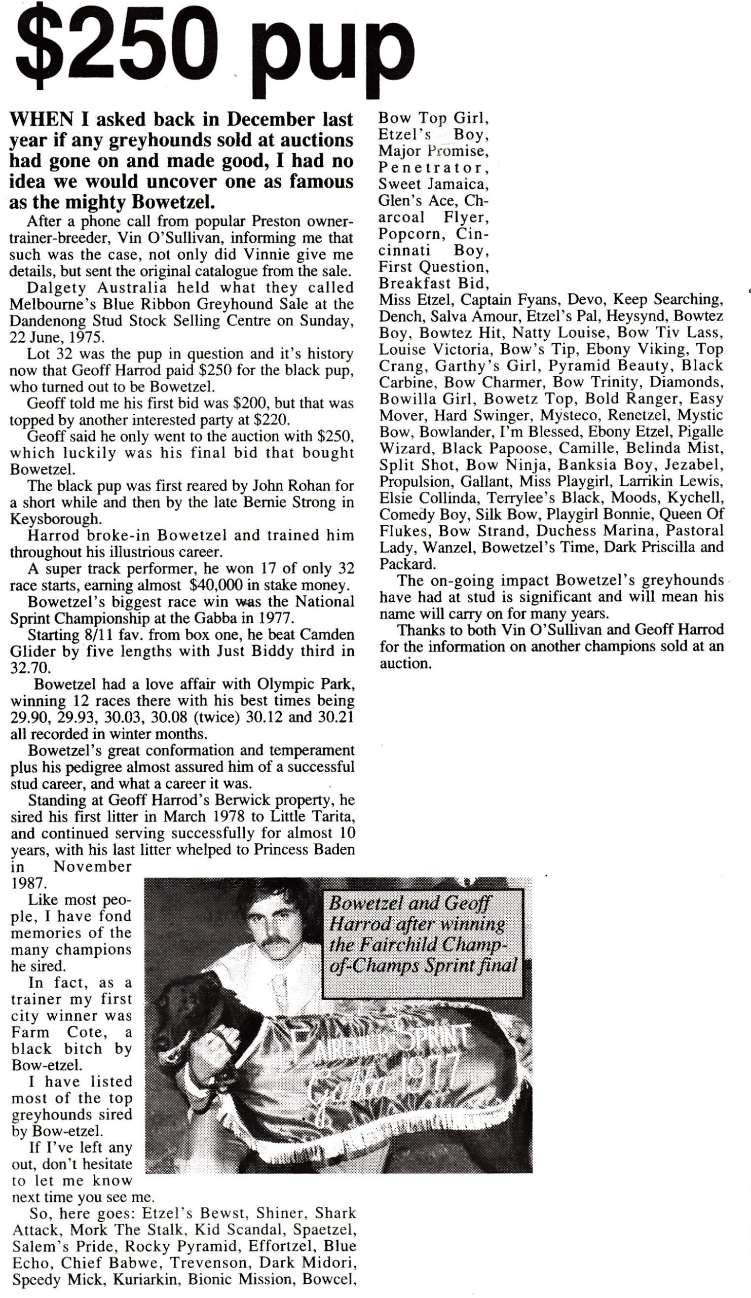 I have featured some information here on the mighty Bowetzel before but hadn’t remembered he was brought at an Auction. I found this story I wrote in the Weekly back in 1995. I now know where the Catalogue came from. Sent to me by the late Vinnie O’Sullivan a lovely bloke and outstanding greyhound breeder. Bowetzel super race dog and wonderful sire. Producer of many champions.