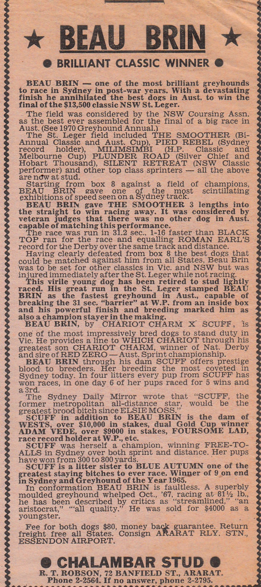 But Warren Harper’s unique achievement was winning the 1969 Paws Of Thunder (then called NSW St Leger) with Beau Brin, a maiden greyhound!