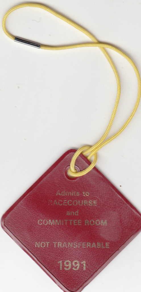 In an earlier post Howard Gray had brought up Sandown’s oldest current living life member Ray Bryon. I think Ray’s 95 I went to his 90th. Joan is still going strong she is about 93 looks 75. Long serving Sandown Director a great bloke. I have fond memories at Sandown Horse track every Sunday morning slipping our dogs up the Steeple track behind Ray’s battery lure. John Reid would run up and back like he was 25 years old. Somehow Ray was sweet with the Track manager and had his own Key to the back gate. Here’s Ray and Joan after winning the National Distance with All Promise, Joan’s giving the dog a Kit Kat they would throw her in jail for doing that these days. Biro gave me this pass which was handy for a number visit’s to the Committee room.