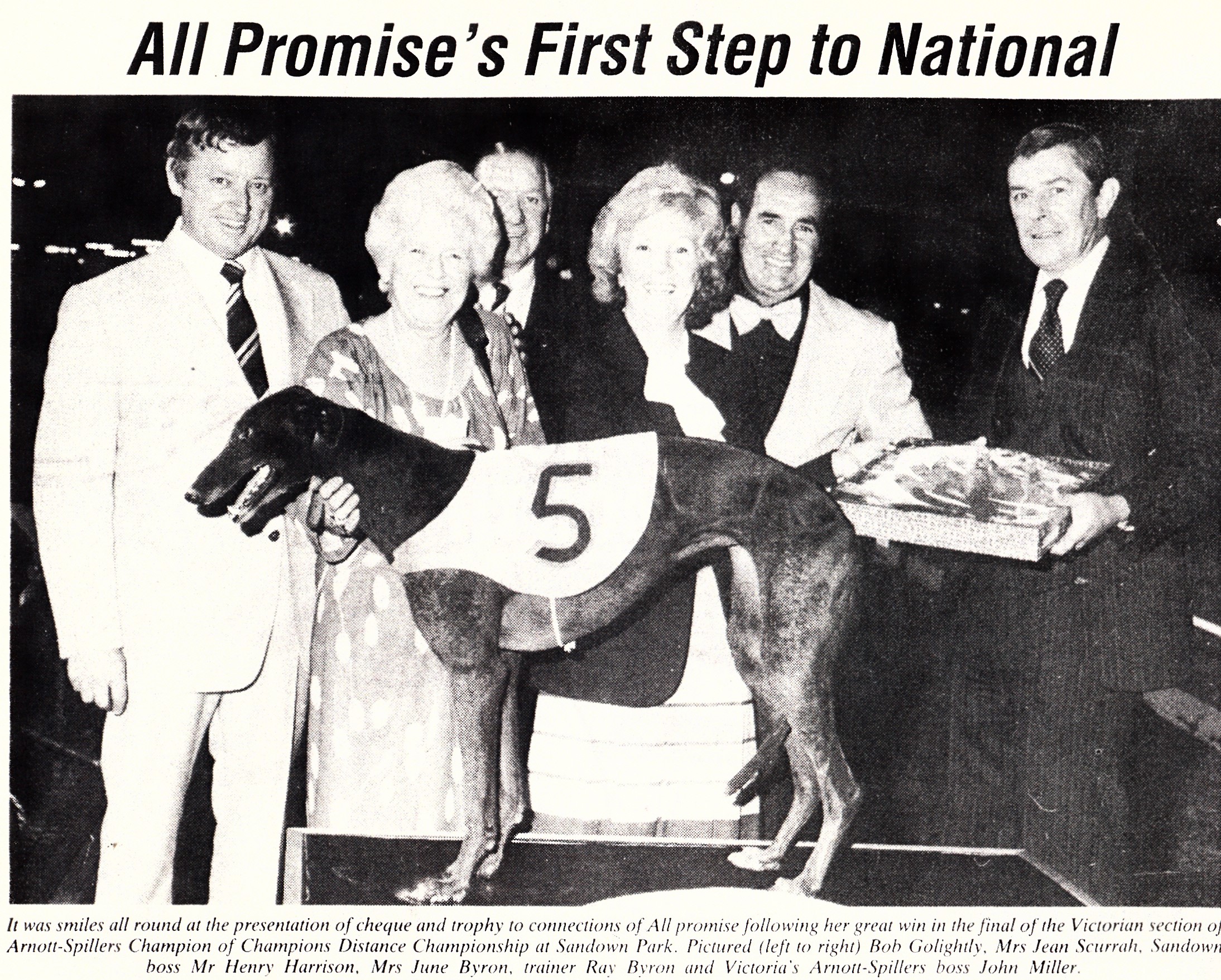 He raced many top performers and considered his best Welcome Girl, a bitch he bred and raced in the mid 1970’s, even though All Promise won the 1980 National Distance Final at Sandown. Another he bred was Perfect Promise who made the Silver Chief final in 1977 which was won by Satan’s Legend. Along with Rupert Lee, Fred Booth, Fred Abel and a few others Ray was in the original group that started the Cranbourne Club and was involved for many years of its early success.