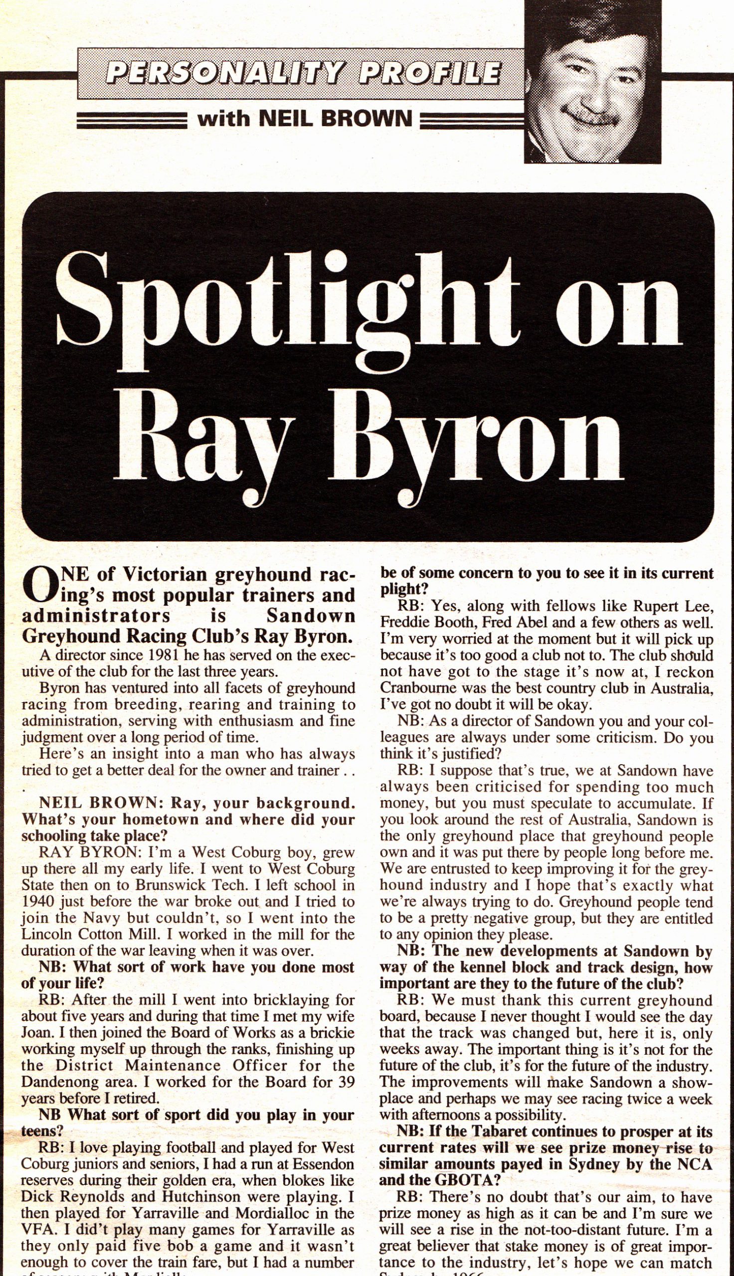 South Australian Howard Gray passed on his memories of Ray. Sorry to see that another great of greyhound racing has passed on. Vale Ray Byron. Had the pleasure of meeting and spending time with Ray when over staying with his great mate Ross Mitchell, both tireless workers for greyhound racing over their many years of involvement. Top bloke and a real character.