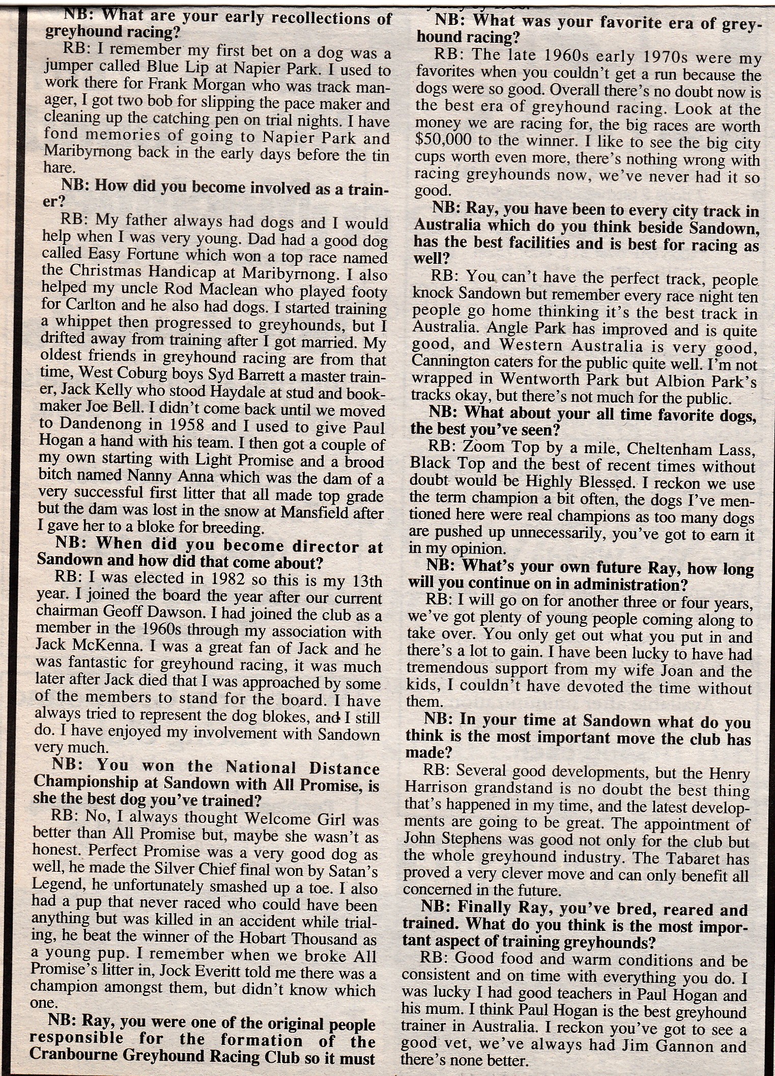 The first bet he had on a greyhound was a hurdler named Blue Lip at Napier Park. He worked at Napier Park for track manager Frank Morgan and was paid two bob to slip the pacemaker and clean up the catching pen. In those days he also attended the Maribyrnong track, Ray’s father always raced dogs, so he helped out from a young age and also assisted his uncle, former Carlton footballer Rod Mclean. He knew and learnt from legendary West Coburg trainers Sid Barrett, Jack Kelly and bookmaker Joe Bell.