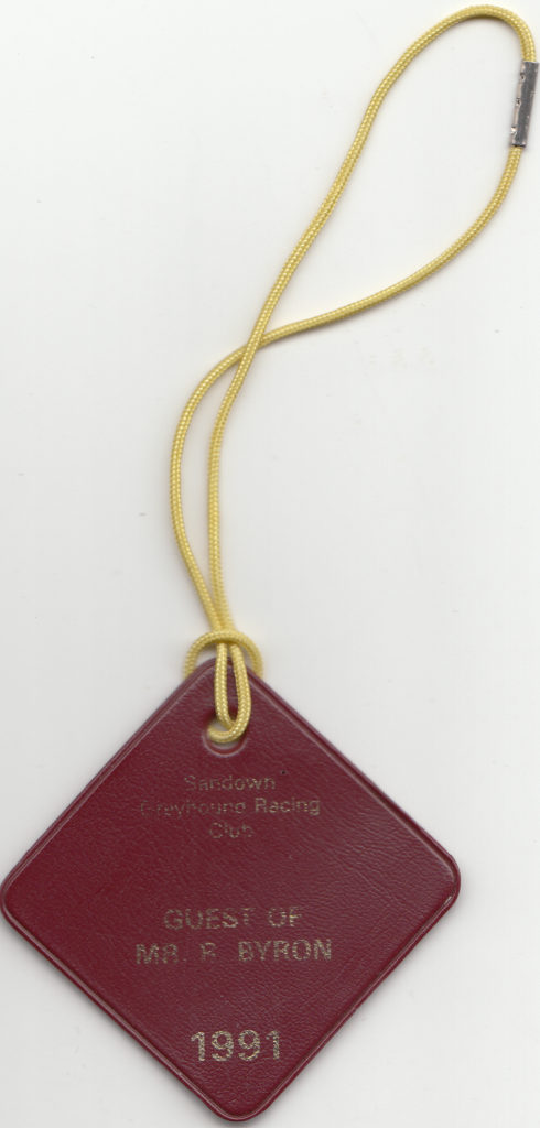 In an earlier post Howard Gray had brought up Sandown’s oldest current living life member Ray Bryon. I think Ray’s 95 I went to his 90th. Joan is still going strong she is about 93 looks 75. Long serving Sandown Director a great bloke. I have fond memories at Sandown Horse track every Sunday morning slipping our dogs up the Steeple track behind Ray’s battery lure. John Reid would run up and back like he was 25 years old. Somehow Ray was sweet with the Track manager and had his own Key to the back gate. Here’s Ray and Joan after winning the National Distance with All Promise, Joan’s giving the dog a Kit Kat they would throw her in jail for doing that these days. Biro gave me this pass which was handy for a number visit’s to the Committee room.