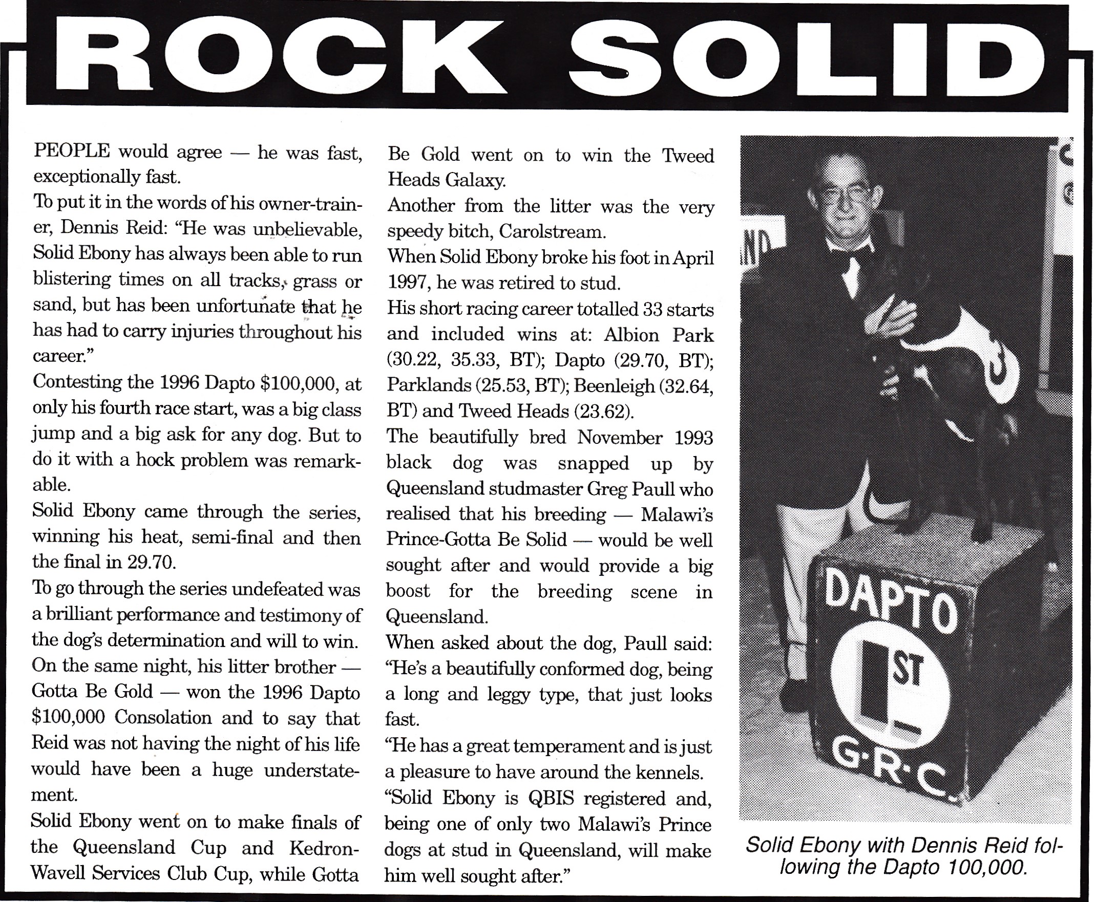 I have been lucky to meet some fantastic people over years. One of them is champion trainer Dennis Reid. Quite a character he has bred and raced some of the best dogs this country has ever seen. Here is a Q and A I did with him back in the late 90’s.