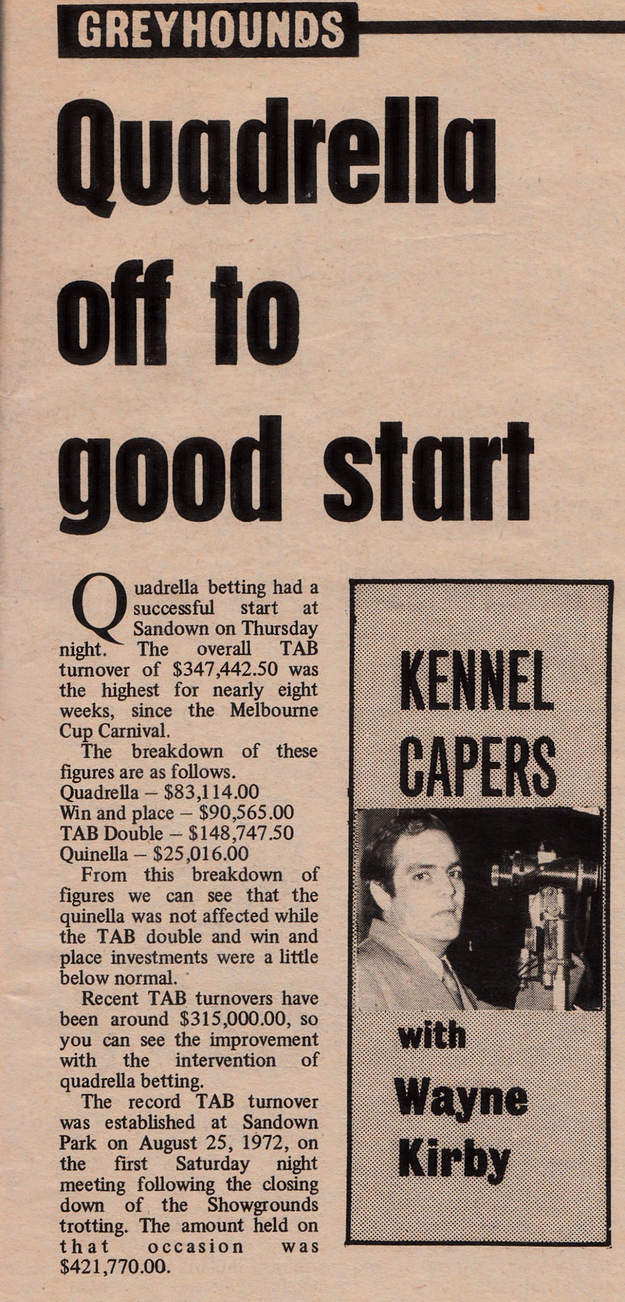 Edwin Caruana– Neil I remember one night in the late 70’s Steve Rice(he moved to the Gold Coast many years ago) got $43,000 out of a Quadrella at Olympic Park, he went and bought a new Statesman.
