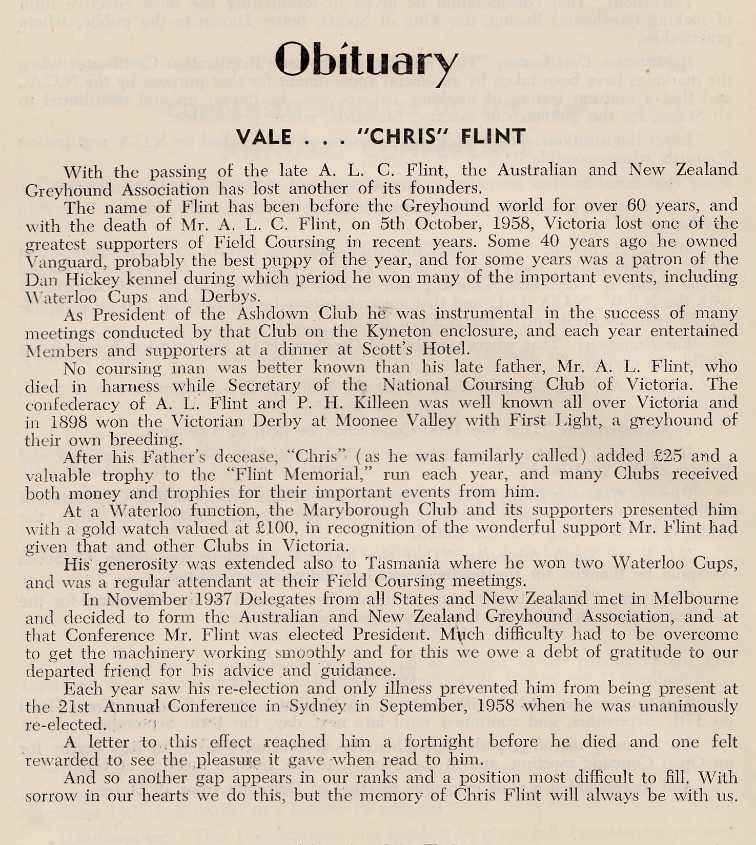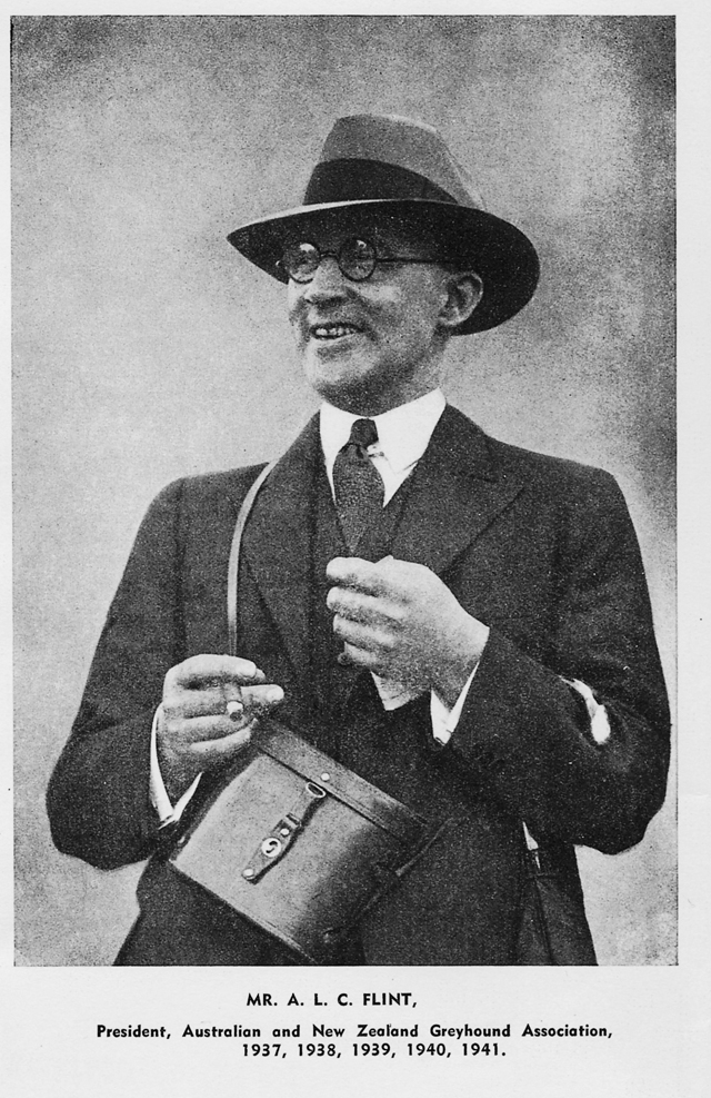 Perhaps the best example of Chris Flint’s foresight was in 1956 when, as Vice-President of the sport’s then controlling body, the National Coursing Association [NCA], Flint had the satisfaction of seeing legislation passed that abolished proprietary [privatised] racing and brought all racing under the control of one body. It was not to be the NCA but a new Greyhound Racing Control Board [now Greyhound Racing Victoria], of which Flint became the first Chairman.