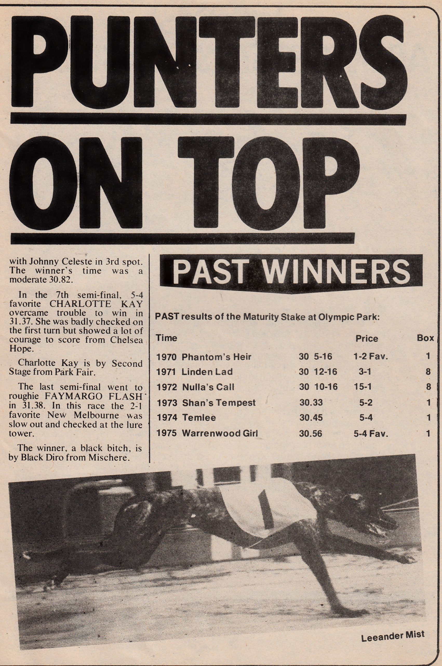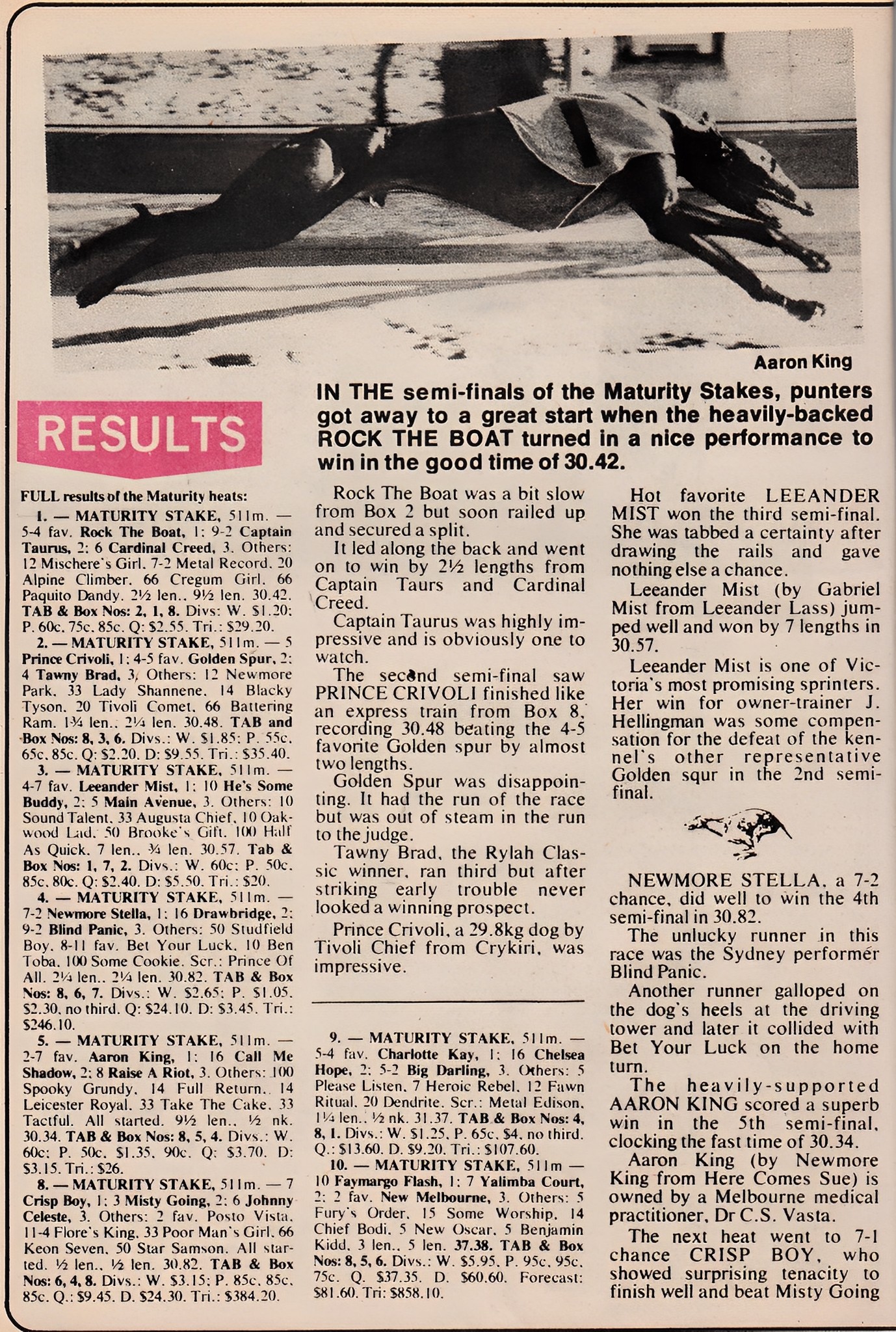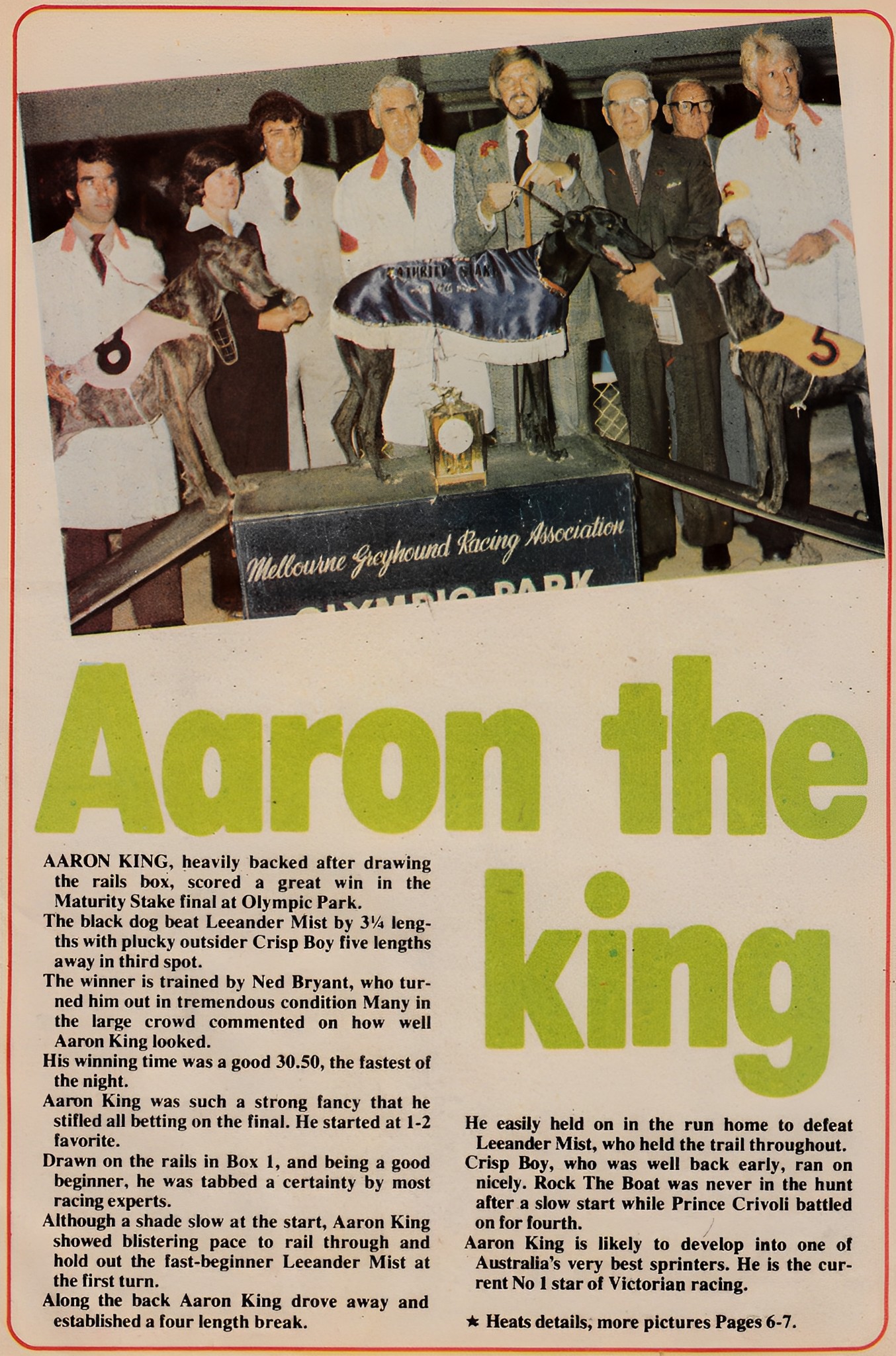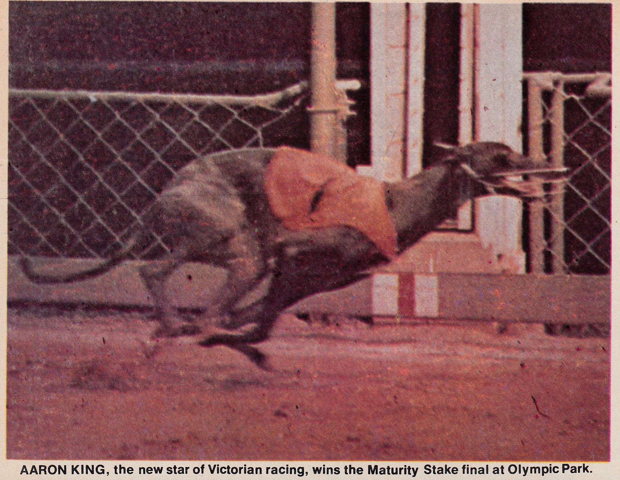 A special dog for master trainer Victorian Hall of Famer Ned Bryant was Aaron King his major win the 1976 Maturity at Olympic Park. Limited opportunities at Stud served 59 bitches in the late 70’s. Someone may recall if produced a top liner.