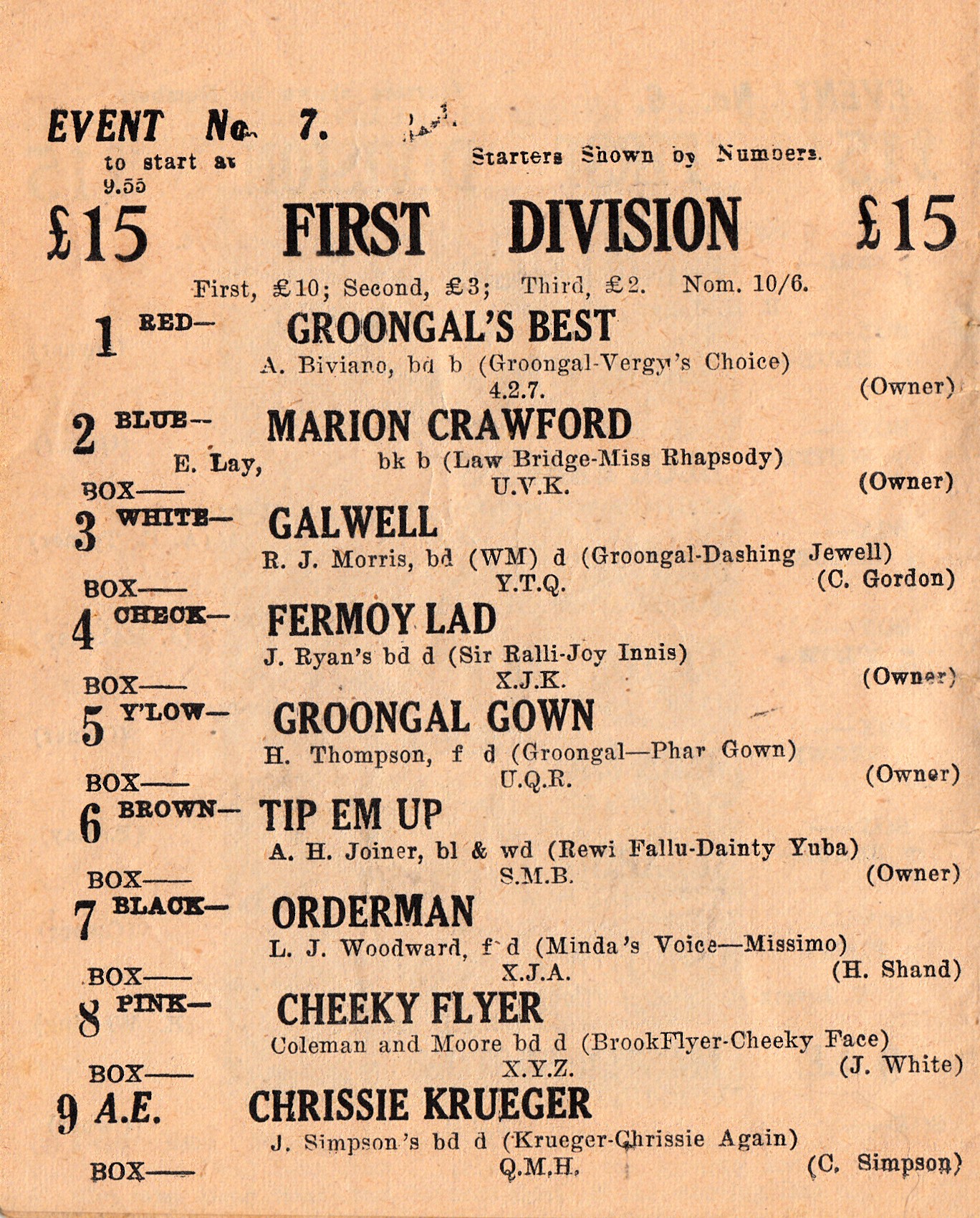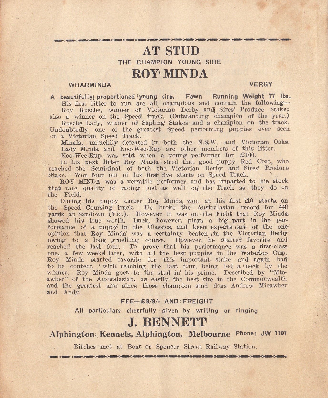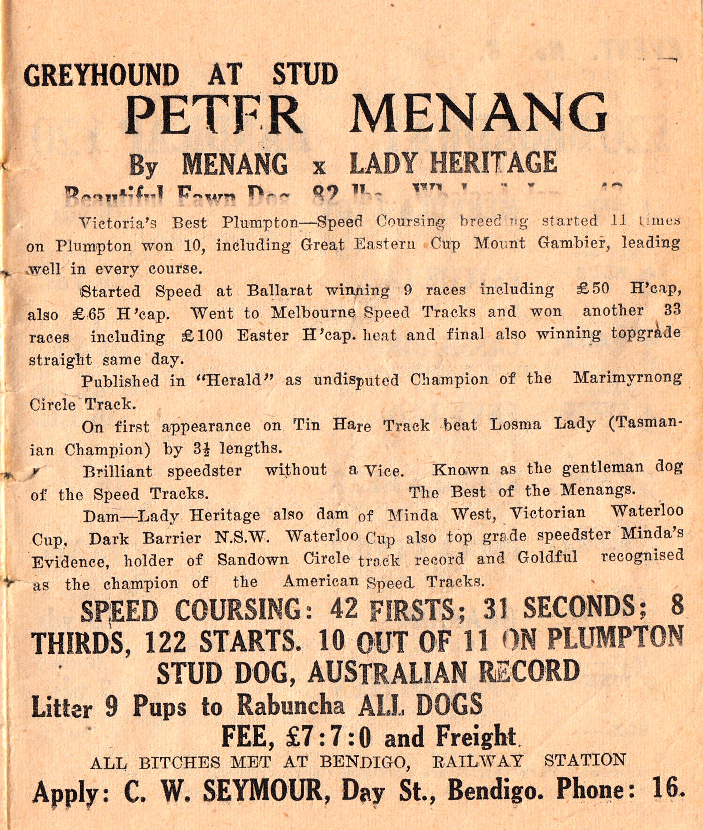 Ron Lance Rogers – Great stuff..thanks for posting..Peter Menang stood at Stud for the Seymour family..Fred Seymour was a great trainer in his own right..people may remember Flash Benny and Flash Maggie..both quality chasers..the family remain in greyhounds with Bernard Seymour, son of Fred, still training, having a lot of success with talented chaser Sir Prize a few years ago..