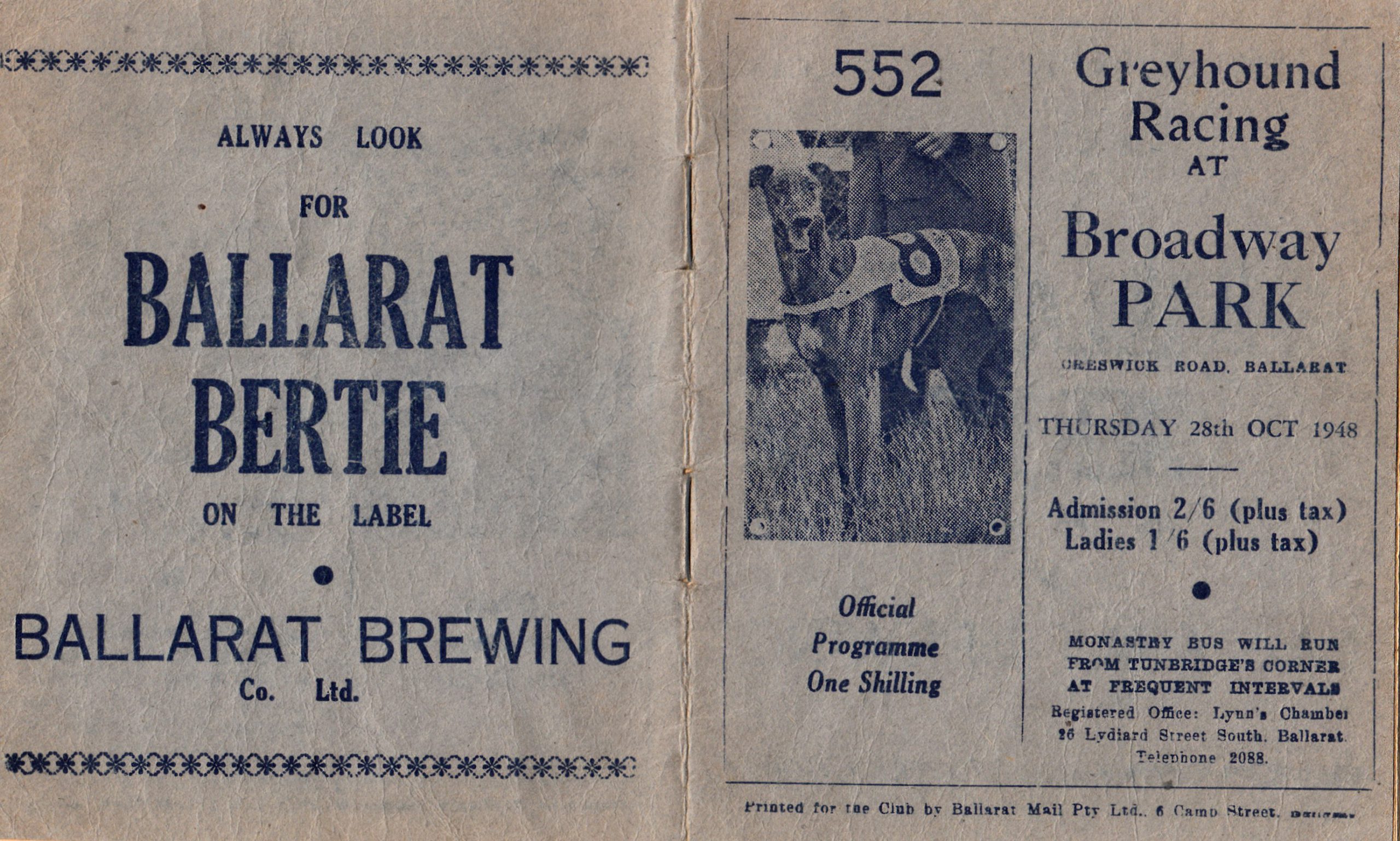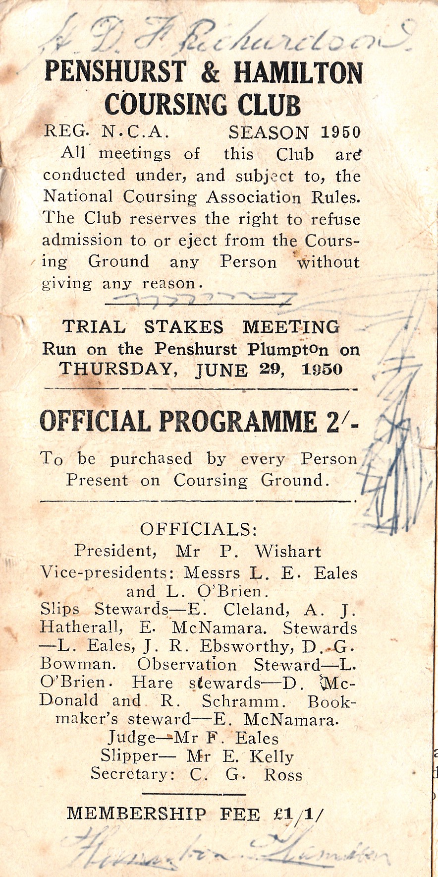 Had a chat today with 92-year-old Alf Richardson from Bendigo. Alf had some memorabilia dropped off at Sandown he thought I might be interesting in. What a charming man to have a yarn with. That’s Alf in the photo with a couple of his first Greyhounds he’s 14 there in 1946. He loved Coursing and there is a ripper shot from the Newspaper of the start of the 1947 Victorian Waterloo Cup at Maryborough the winner Devon Alert has the red collar, and he beat Tinkerman that year. The Slipper is Chas Tonkin who slipped every Waterloo Cup from 1931 until 1950. Judge was the great Eric Herbert. There was also a book on how to train dogs with some Stud ads and a Ballarat Race Book from 1948. I couldn’t help putting the ad in from the Ballarat Picture Theatre and what was on twice a day at that time. In the Stud Ads how are the Stats on the dog Peter Menang extraordinary. Everything can go into the Sandown Museum thanks Alf.