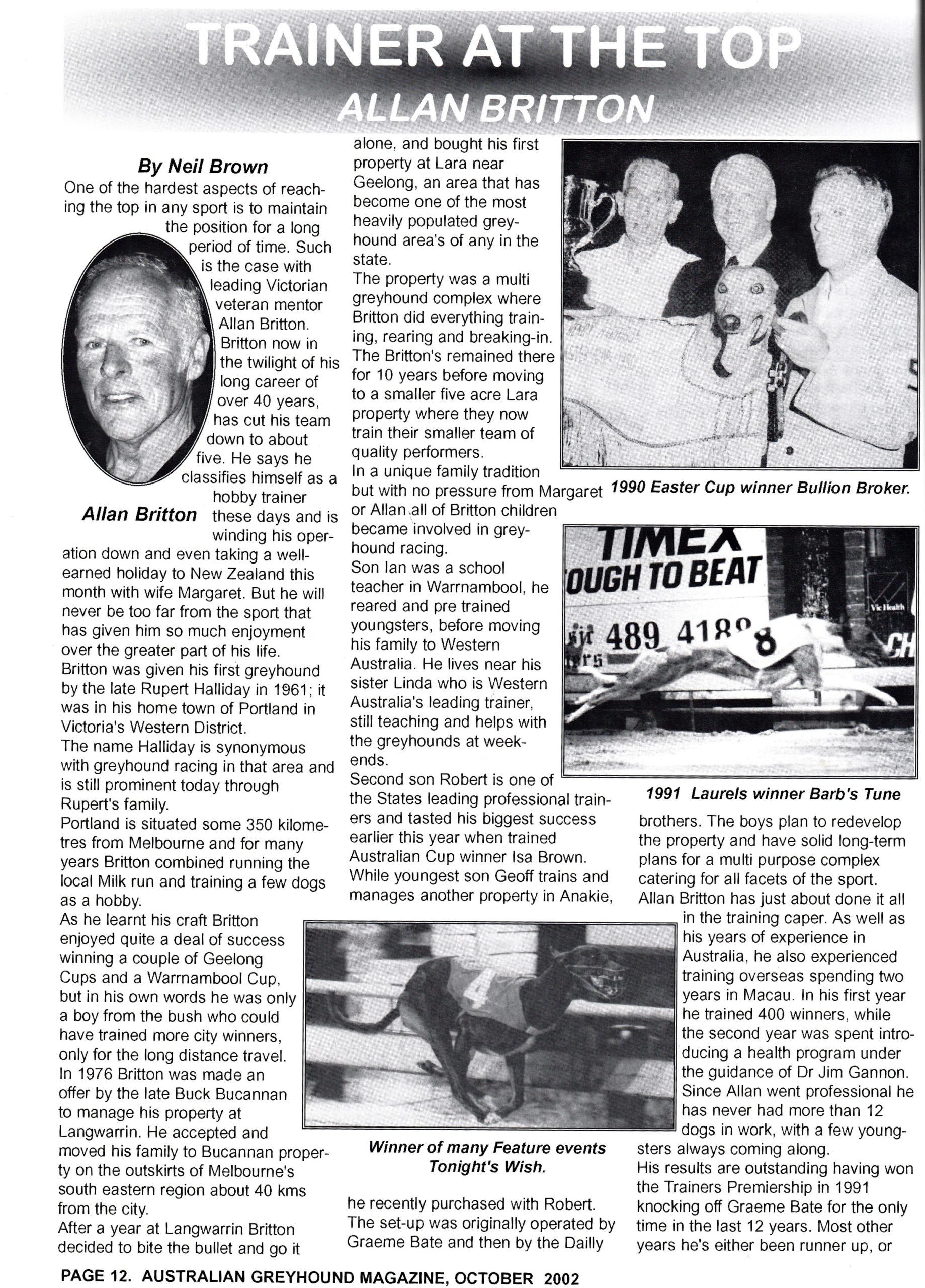 Allan Britton is involved in greyhound racing on a minor scale these days, however it was a different story in the 1950s-1990s when he was a powerhouse trainer despite only ever breeding and training a small team of greyhounds.