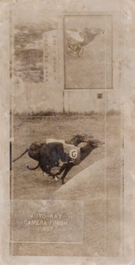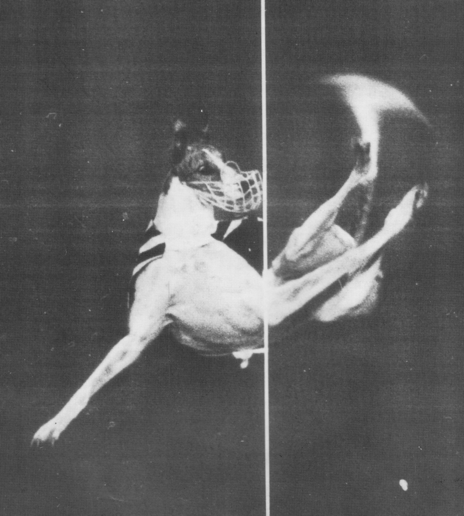 An unusual way to get across the line, this amazing photo finish occurred in May 1980 when Fullamusic (Lively Band x Fullatrix) claimed third prize at Cannington Western Australia. The white and brindle dog after tripping over a wire left on the track, tumbled, was catapulted into the air, he then somersaulted and crashed to the grass. Although his tail was wagging past the post. Fullamusic had to put his muzzle on the line to officially finish. Following the fall he raced with a few hesitant gallops, before regaining his confidence and saluted in two of his next four starts at the track.