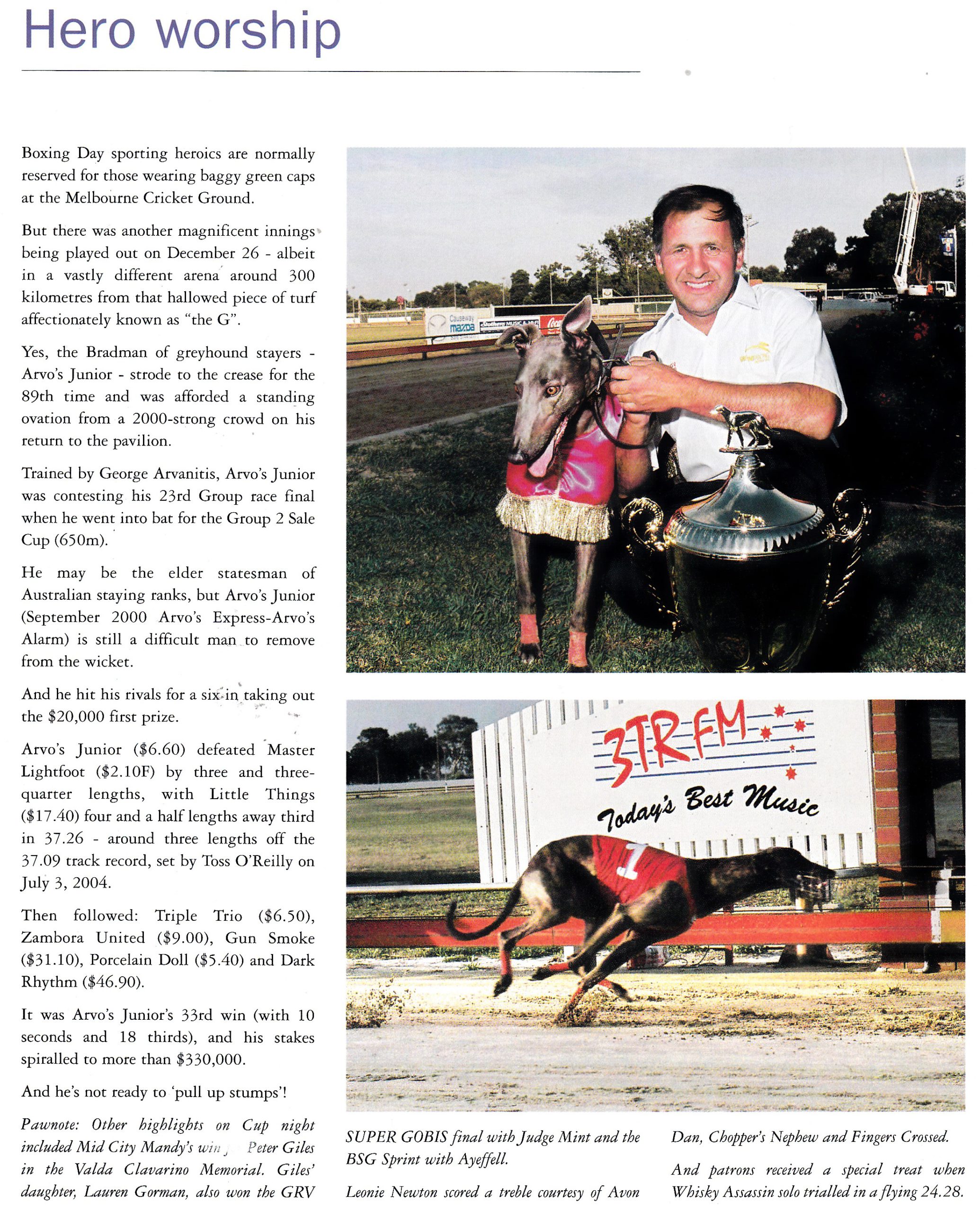Trainer: George Arvanitis, Nyora VIC, Starts: 93; 34-11-18, Prize money: $325,420 Group wins: G1 Sandown Cup, G1 National Distance Championship, G2 McKenna Memorial; G2 Sir John Dillon Memorial; G2 Sale Cup; G2 Maidment Memorial, G3 Lizrene Classic; G3 AWM Distance Championship.