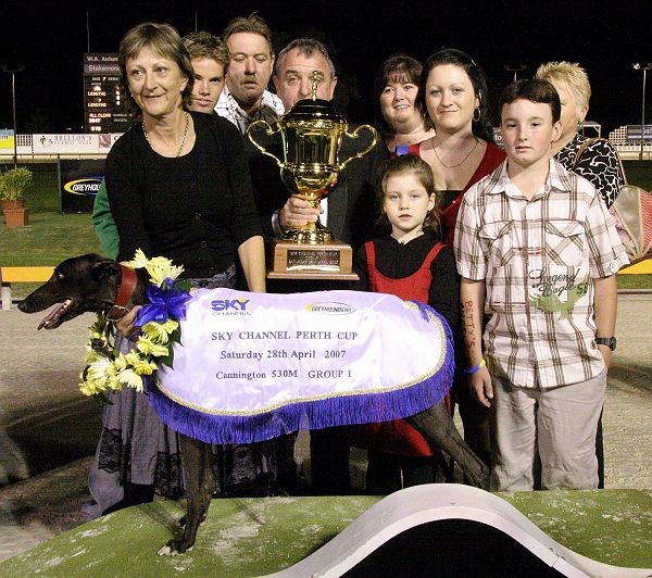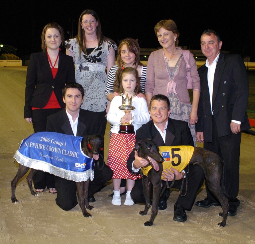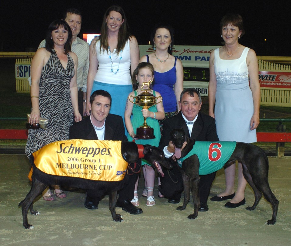 What a great little chaser Betty’s Angel was she led all the way in the 2006 G1 MELBOURNE CUP recording 29.51 when she beat her litter sister. She also won the 2006 G1 SAPPHIRE CROWN CLASSIC three weeks earlier. Her third group 1 was the 2007 Perth Cup. By Brett Lee from Leprechaun Yap whelped 1st of November 2004. Bred raced and trained by the Bartolo family. She had 43 starts for 20 wins and 10 placings for $441,570 in prizemoney. She started her race career in a maiden race 12 at the Meadows in June 2006. She won by 14 and half lengths in the a best of the meeting 29.76 came out a week later and ran identical time in winning again. Her best time at Sandown was 29.51 and Angle Park she won in 29.17 and 29.12. She also won at Albion Park and Cannington, had two starts at Wenty for a second and a third in the Egg heat and semi. Betty’s Angel won the 2006 Victorian and AGRA Greyhound of the Year awards. She produced 18 pups from four litters to Spiral Nikita, Token Prince, Bombastic Shiraz and Lonesome Cry. Her best pups were Ed Pacino, Prince Holyfield, Token Spinner, Ritza Ronnie and Lonesome Boy.