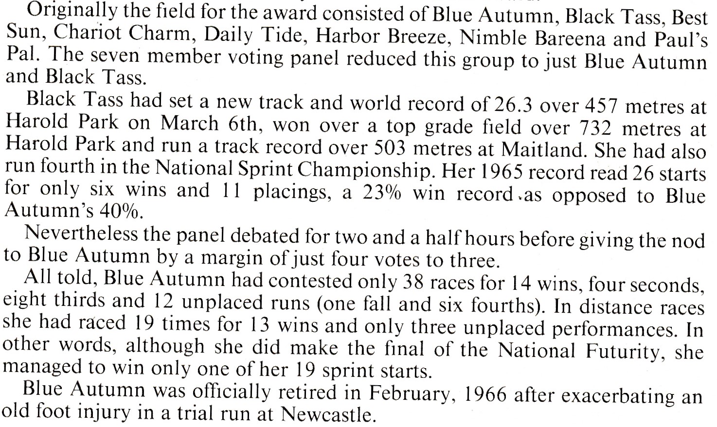 Jeff Collerson – Blue Autumn was the first NSW Greyhound of the Year award winner (in 1965). She was raced by Bert & Jean Johnson ho also trained Blue Autumn’s nearly as talented litter sister Scuff, also a stayer