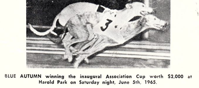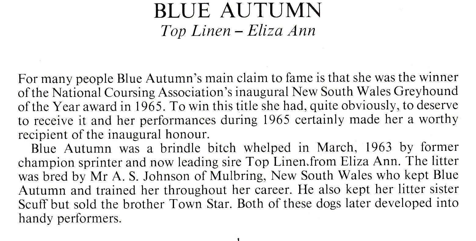 Jeff Collerson – Blue Autumn was the first NSW Greyhound of the Year award winner (in 1965). She was raced by Bert & Jean Johnson ho also trained Blue Autumn’s nearly as talented litter sister Scuff, also a stayer