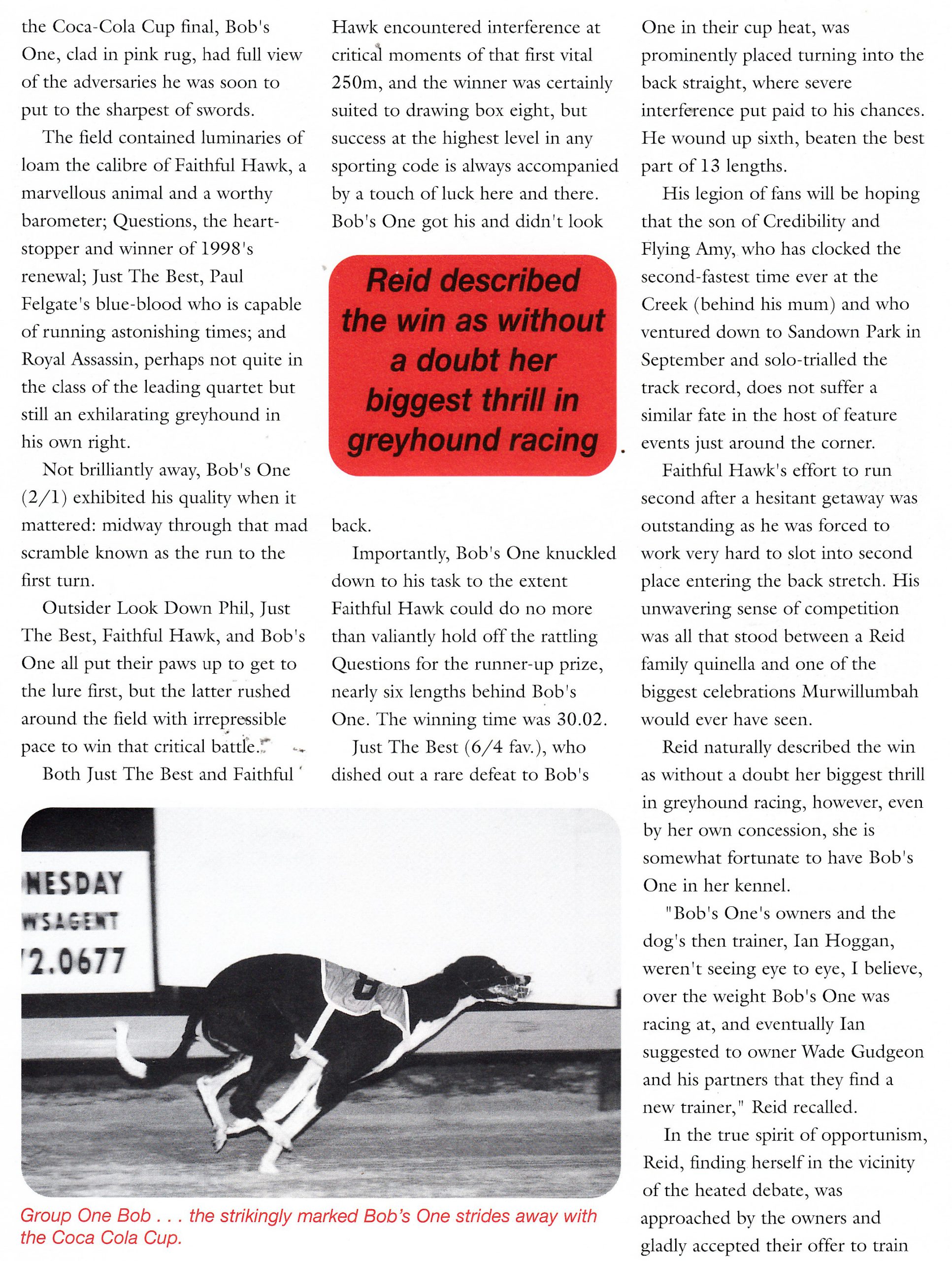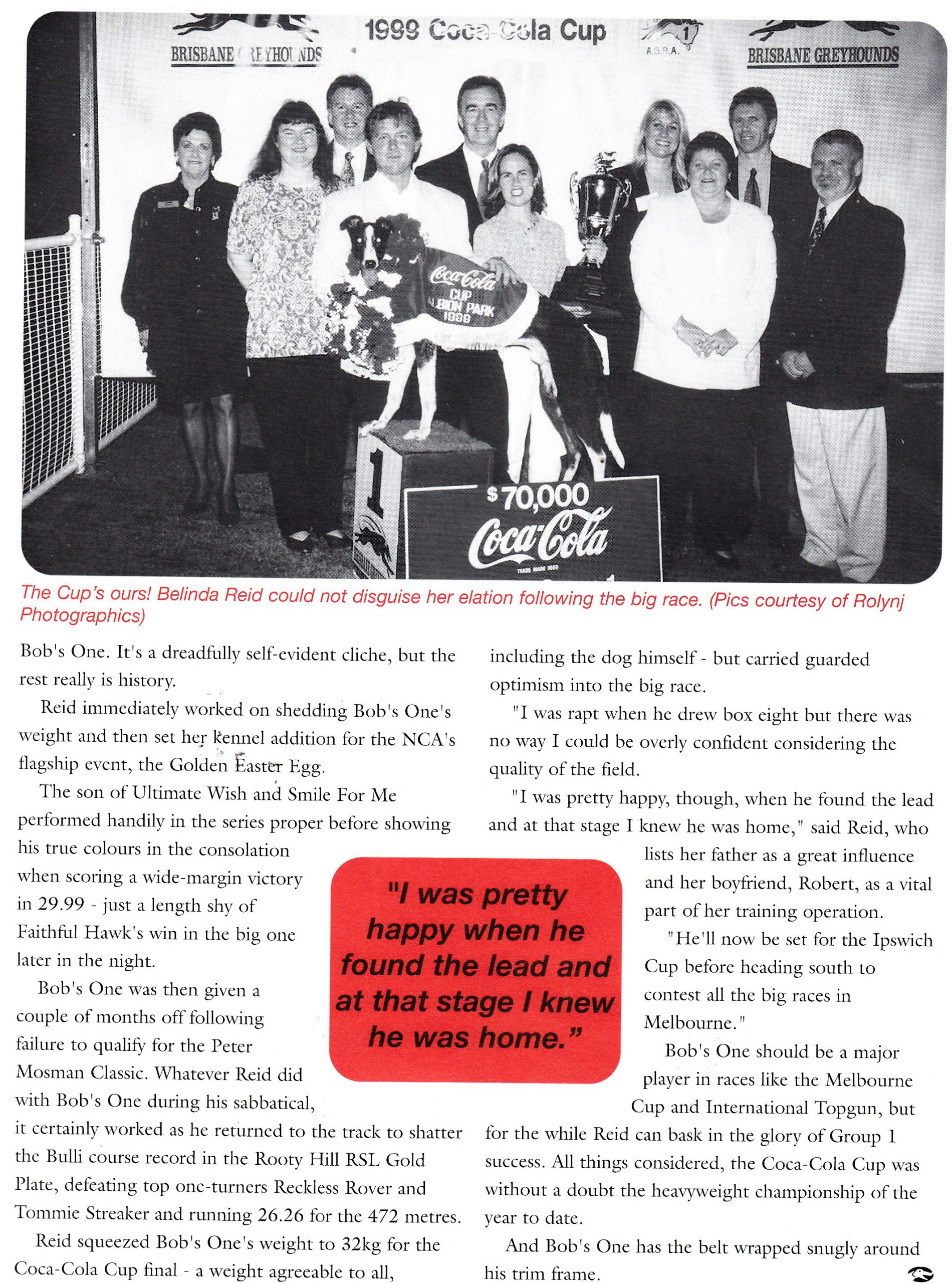 Top class sprinter for Belinda Reid, Bob’s One. Belinda was from great stock wonderful family of Old Benalbo in the Northern Rivers New South Wales. None better than Dennis the number of stars that came out of Clover Park, too many to count. I’m not sure I have met many better blokes than Dennis Reid.