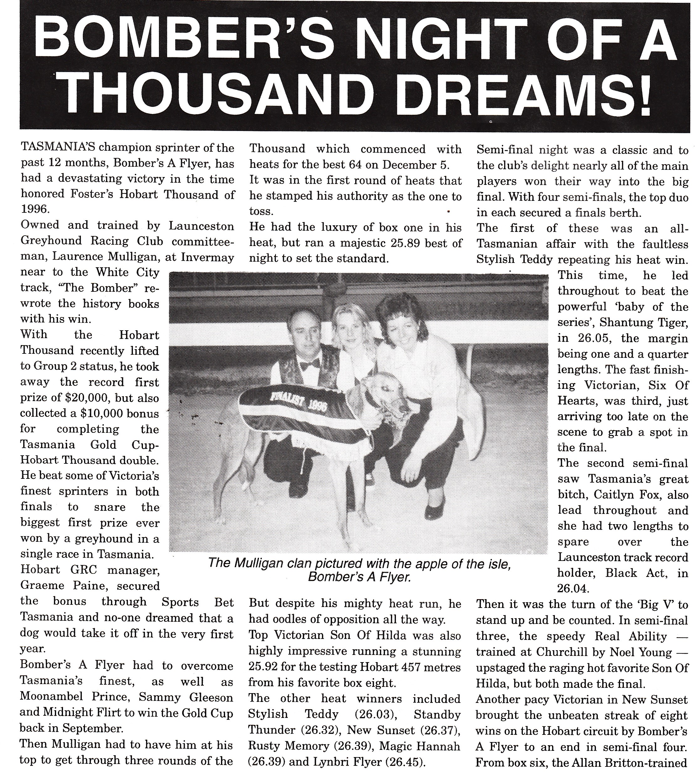 Still on an amazing roll of success, “Bomber’s” next nineteen starts yielded 13 wins and 6 seconds. With it came even more feature race success. December 1996 and the Hobart Thousand arrived. The H.G.R.C had organised a special $10000 bonus for any dog that won the Gold Cup – Hobart Thousand double.“Bomber” had won the first leg, but the now Group Two Thousand was a different level again.