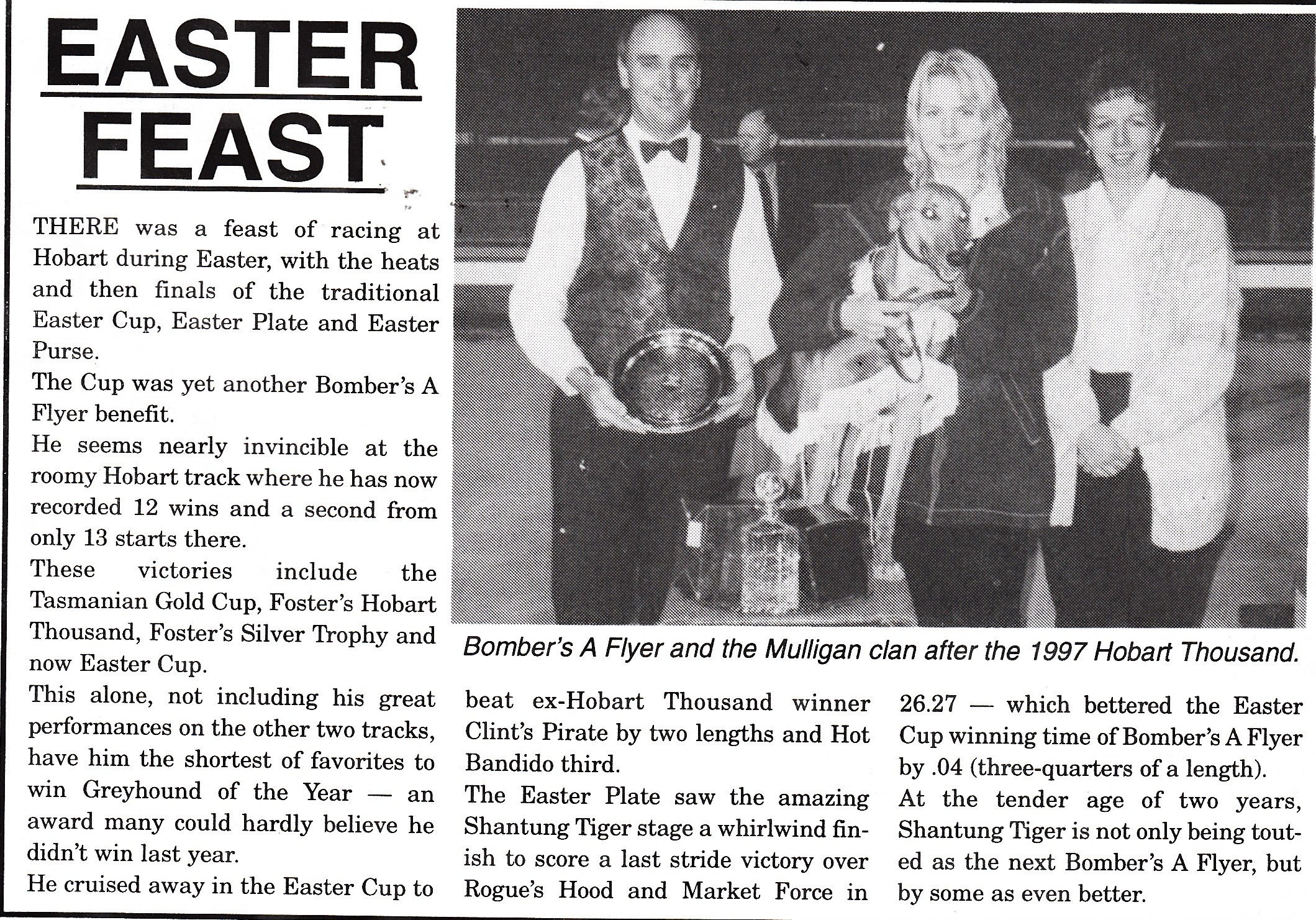 Still on an amazing roll of success, “Bomber’s” next nineteen starts yielded 13 wins and 6 seconds. With it came even more feature race success. December 1996 and the Hobart Thousand arrived. The H.G.R.C had organised a special $10000 bonus for any dog that won the Gold Cup – Hobart Thousand double.“Bomber” had won the first leg, but the now Group Two Thousand was a different level again.