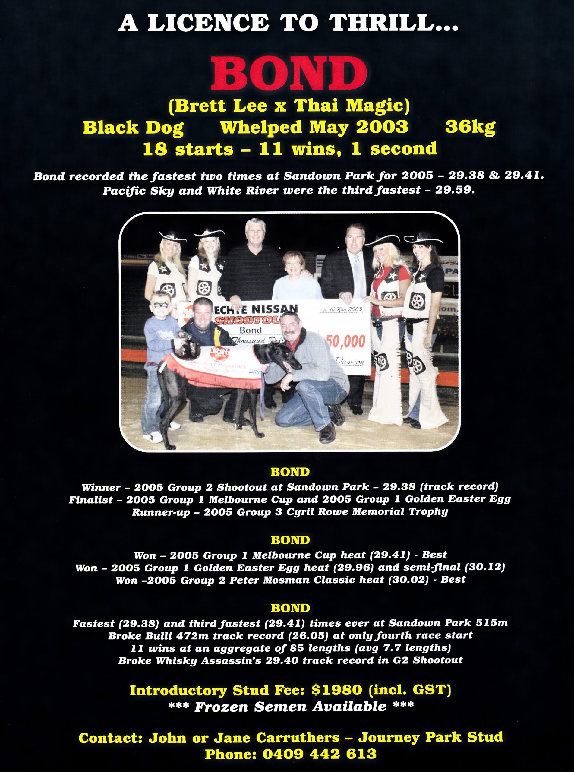 Bond (Brett Lee x Thai Magic) 18 Starts 11 wins $66,825. Won the 2005 Sandown Shootout in track record time of 29.35. Top field Trewly Special, Lord Monelli and Pure Octane. Breeder Julie Fletcher. Sired 2056 offspring. His best pup Mr.Metz.