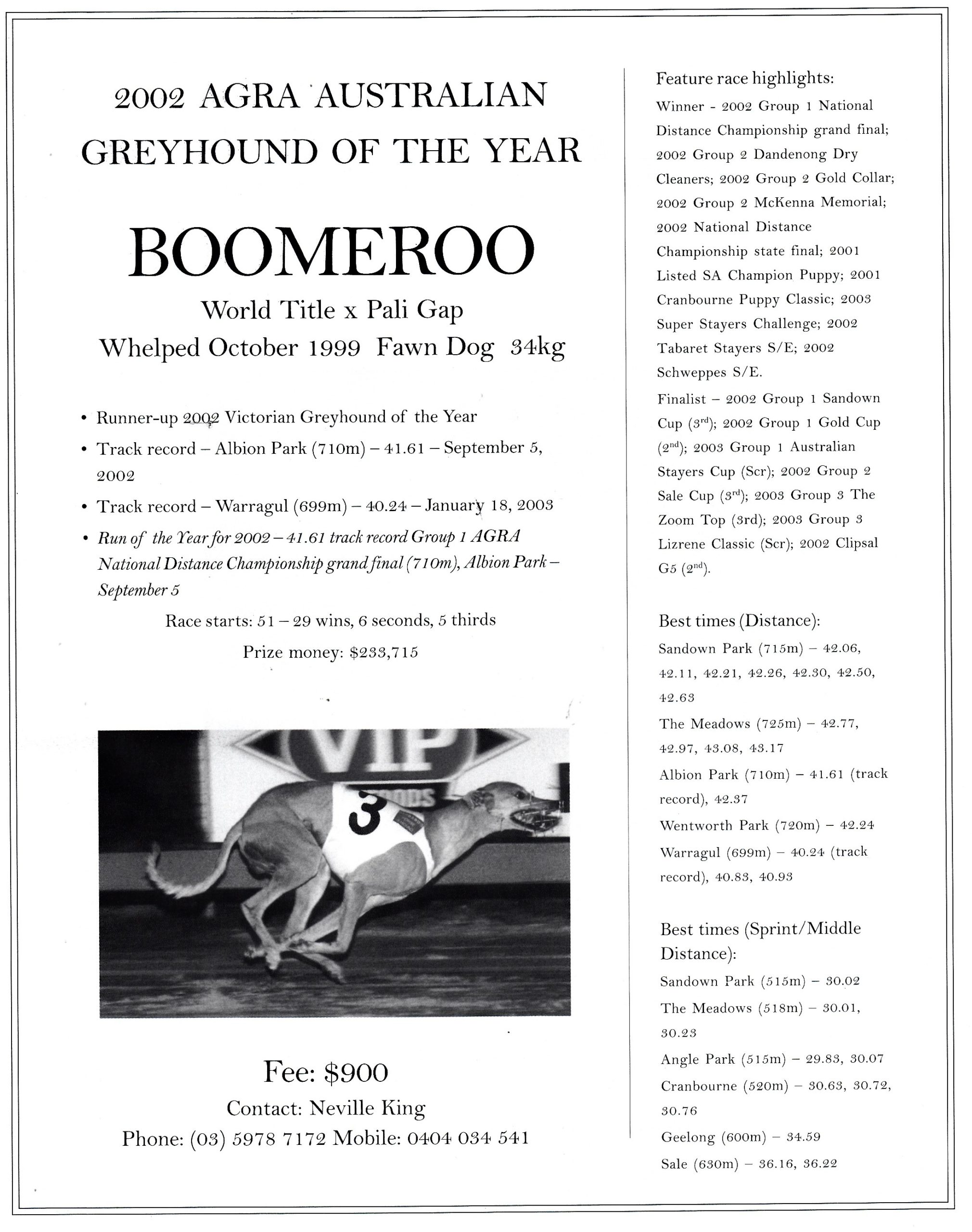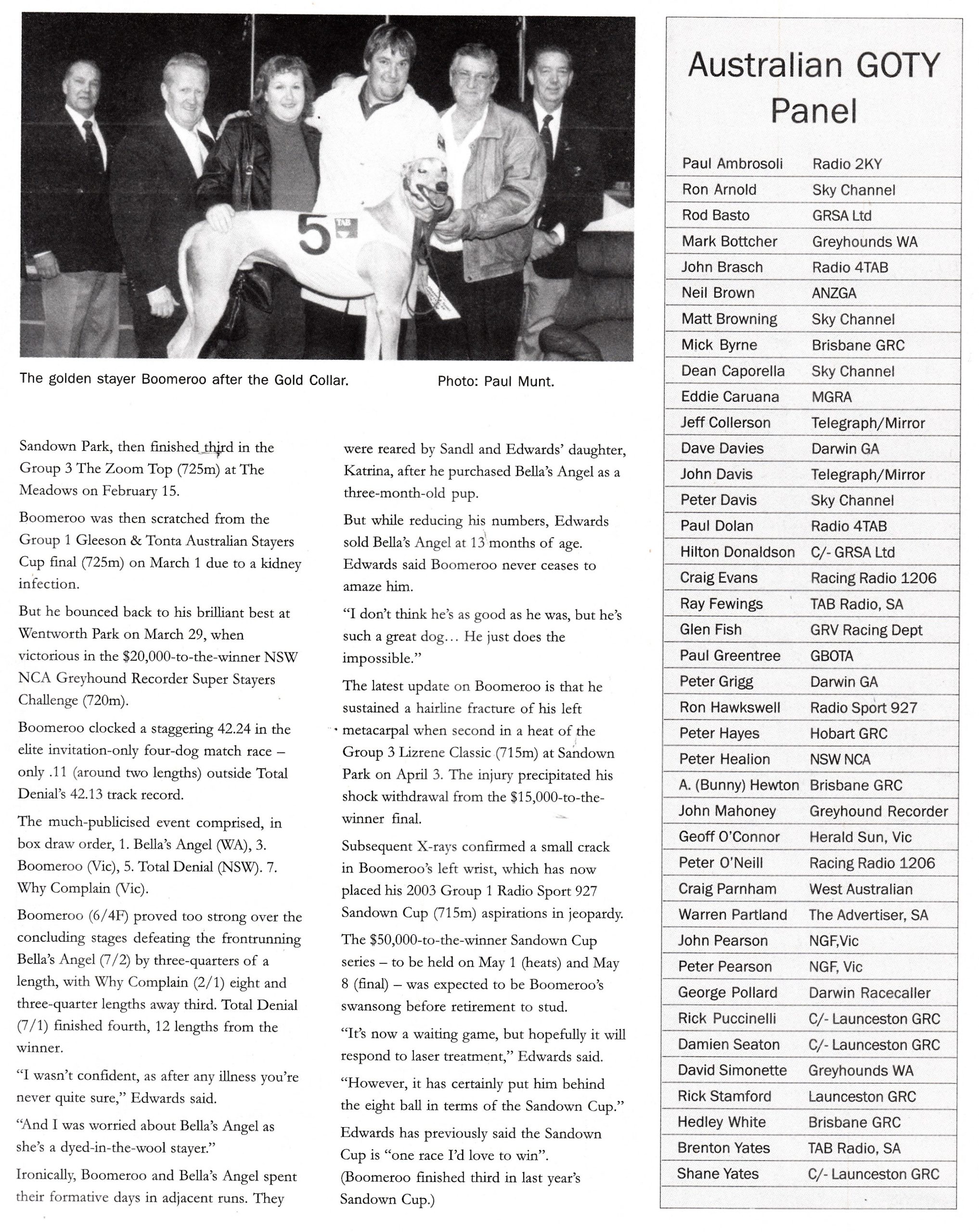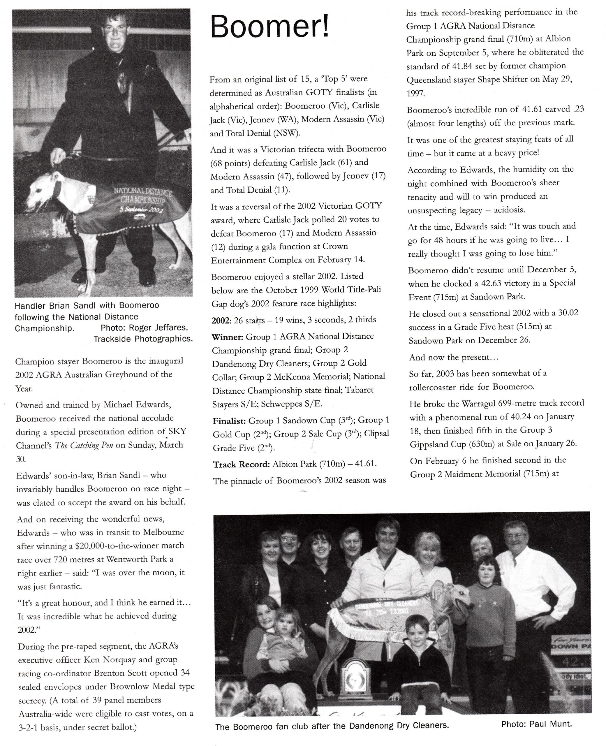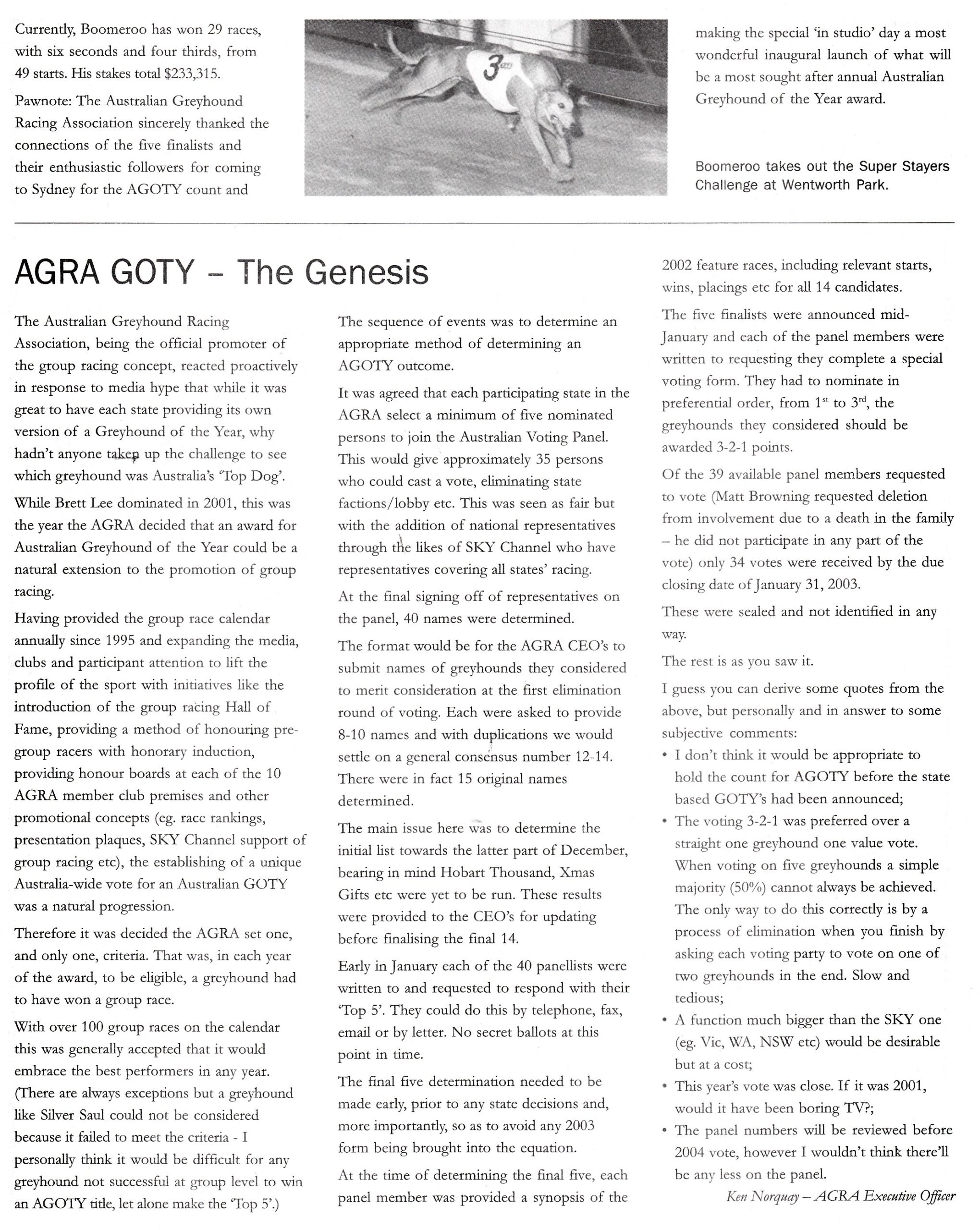 One pf the real smart stayers of the early 2000’s was Boomeroo. The inaugural AGRA Greyhound of the Year in 2002. Raced and trained by Michael Edwards a lovely bloke, Boomer’s full stats are below. What about the process to determine the GOY and the list of names who were judges I see I made it as the ANZGA rep. The process has been streamlined since then I can tell you with no media involved whatsoever. She’s A Pearl was winner number 20.