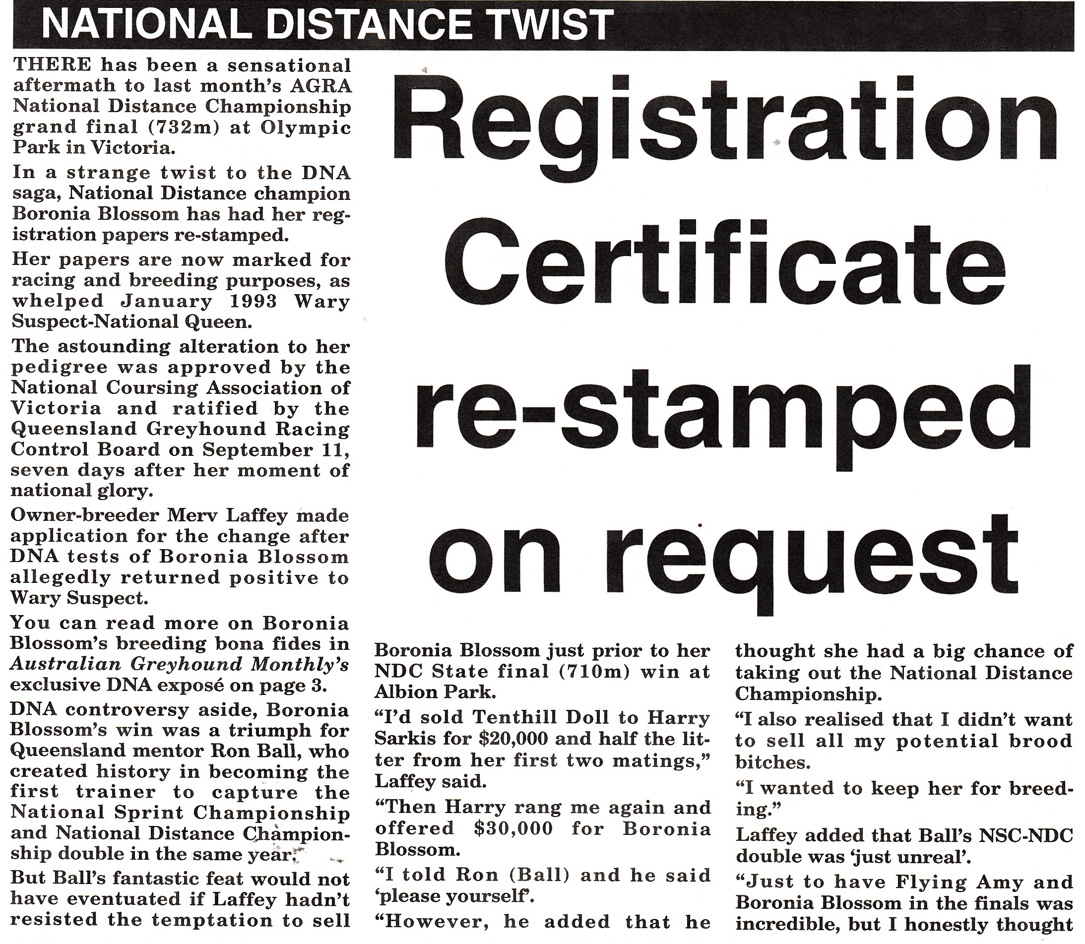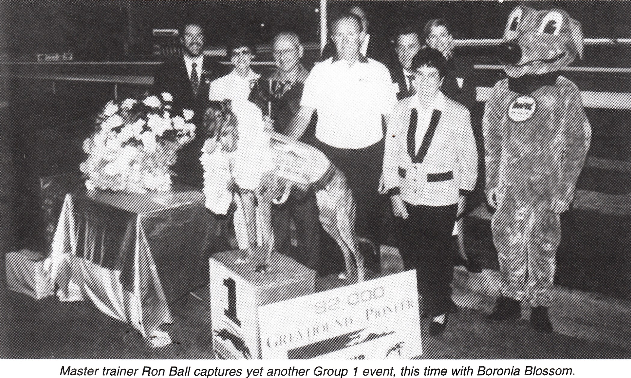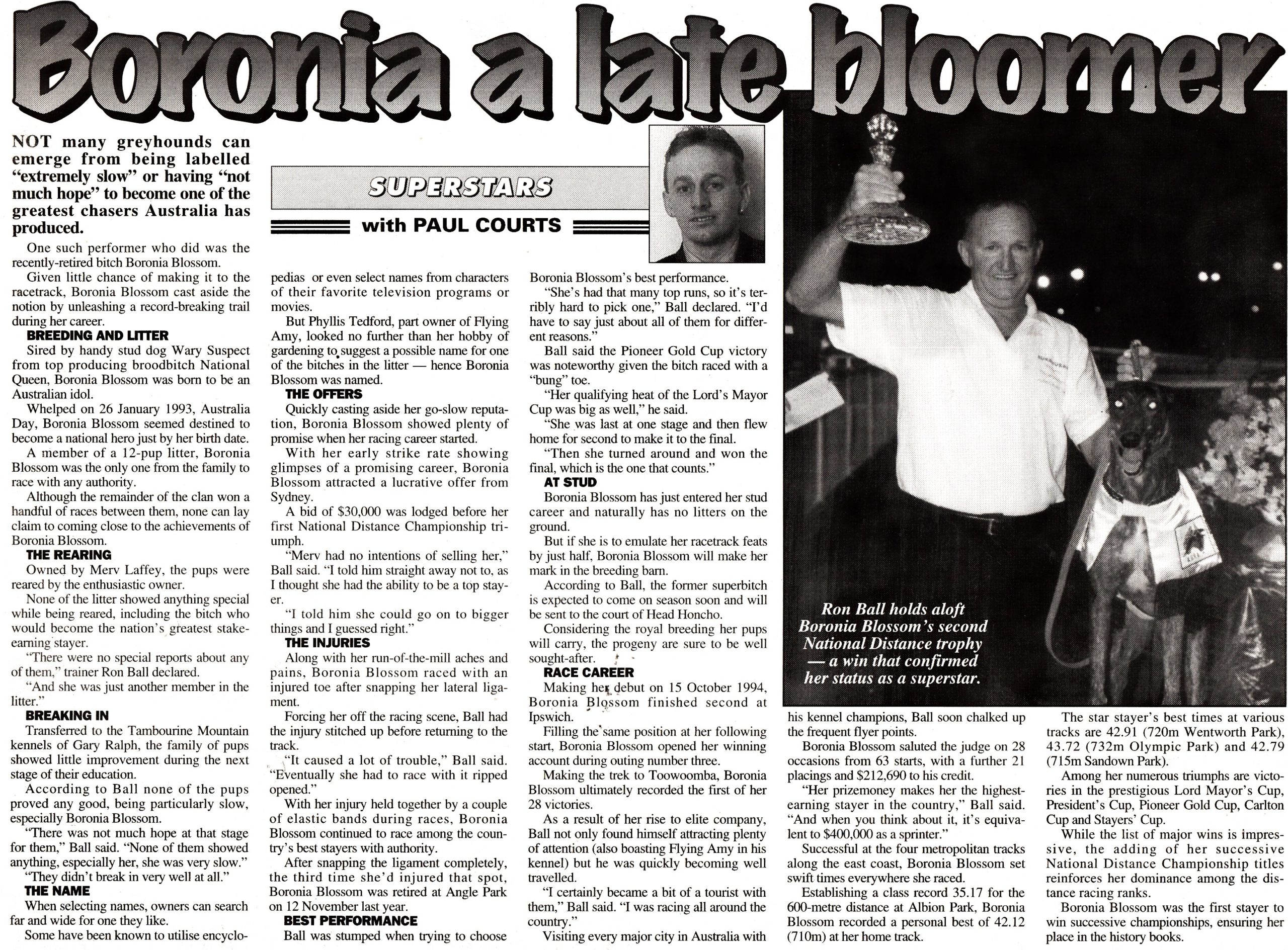 Ron Ball’s champion stayer Boronia Blossom. For the record she had four litters two to Head Honcho, a litter to Master Havoc and one to Malawi’s Prince 30 pups in all with nothing jumping off the page.