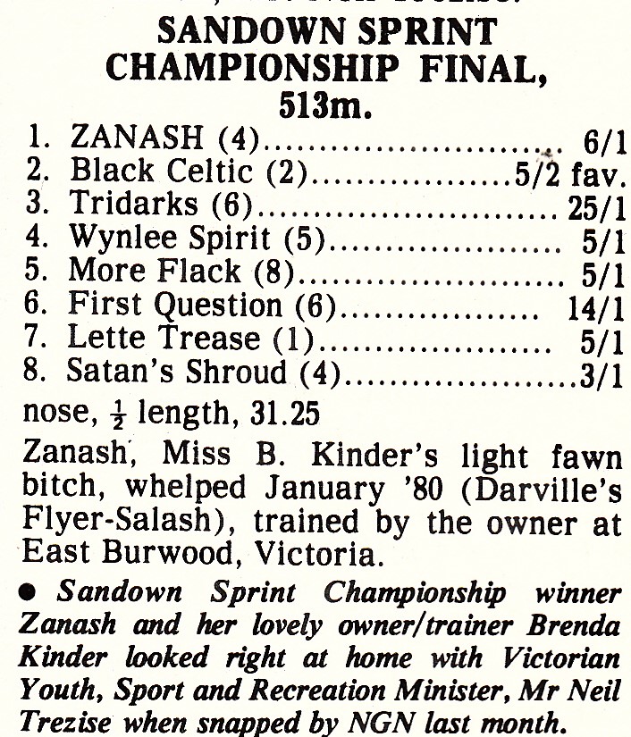 Brenda Kinder with Sports Minster and former Geelong champ Neil Trezise. Zanash was very smart bitch how’s the field she beat here. Not sure of stats Brenda might let me know so I can include on website. She did finish 3rd in the 1983 Australian Cup behind Drop of Wine.