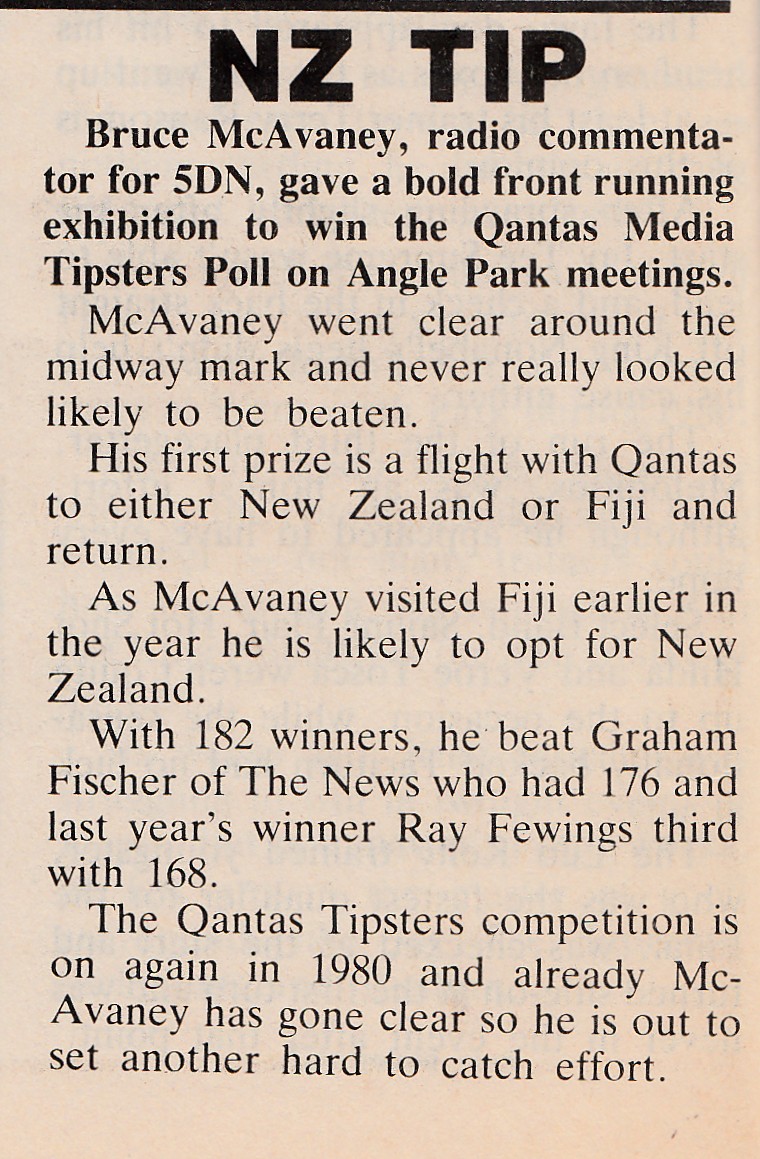 Is there anything the great Bruce McAvaney OAM can’t do when comes to broadcasting. We can claim him as one ours having got a start calling Greyhounds in South Australia. Seems he wasn’t a bad judge back 1980 he won the Qantas Media Tipsters Poll beating another couple of SA legends Graham Fischer and Ray Fewings. We have listened to the super broadcaster over many years. Talented plus at all sports you name it.