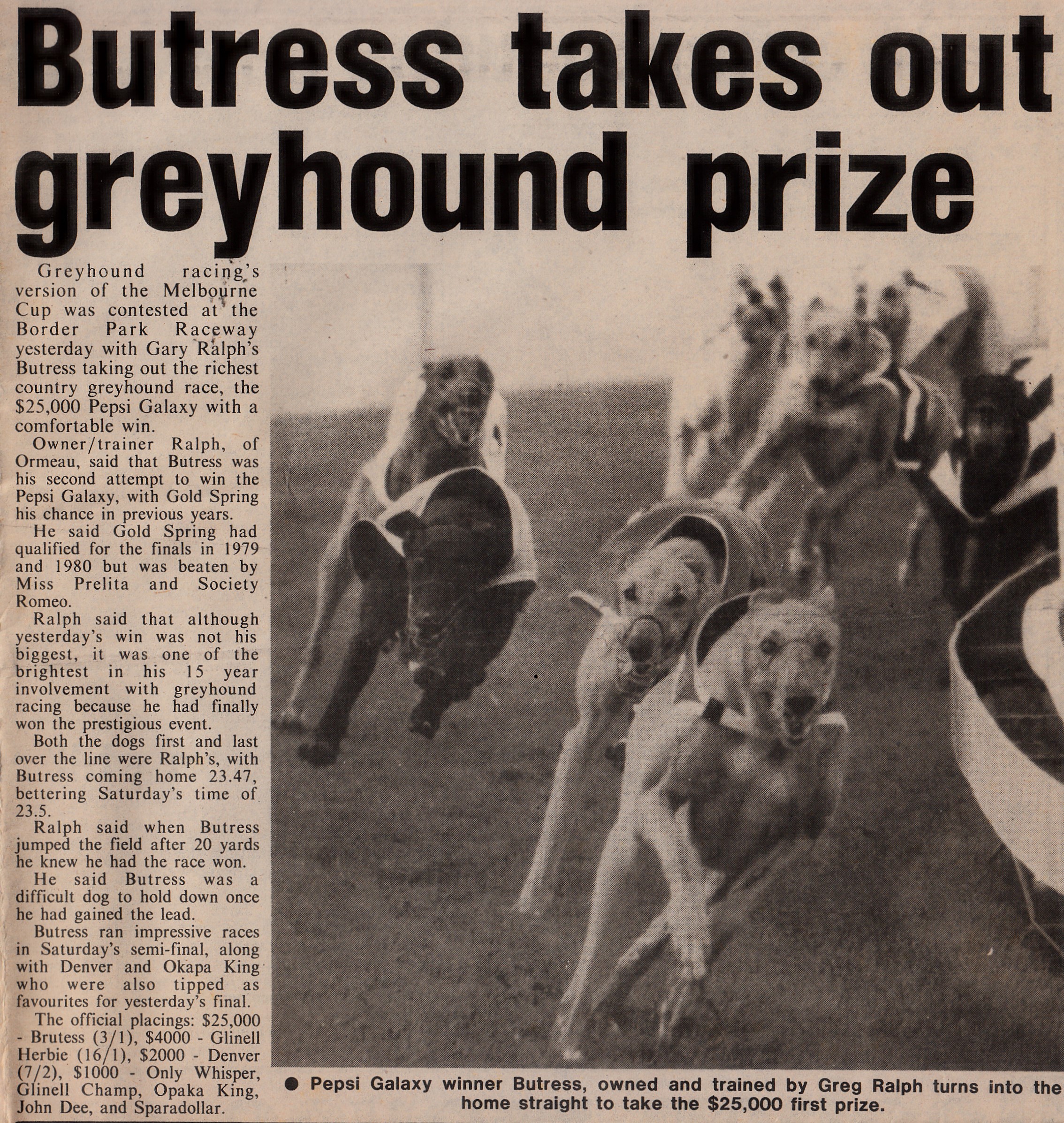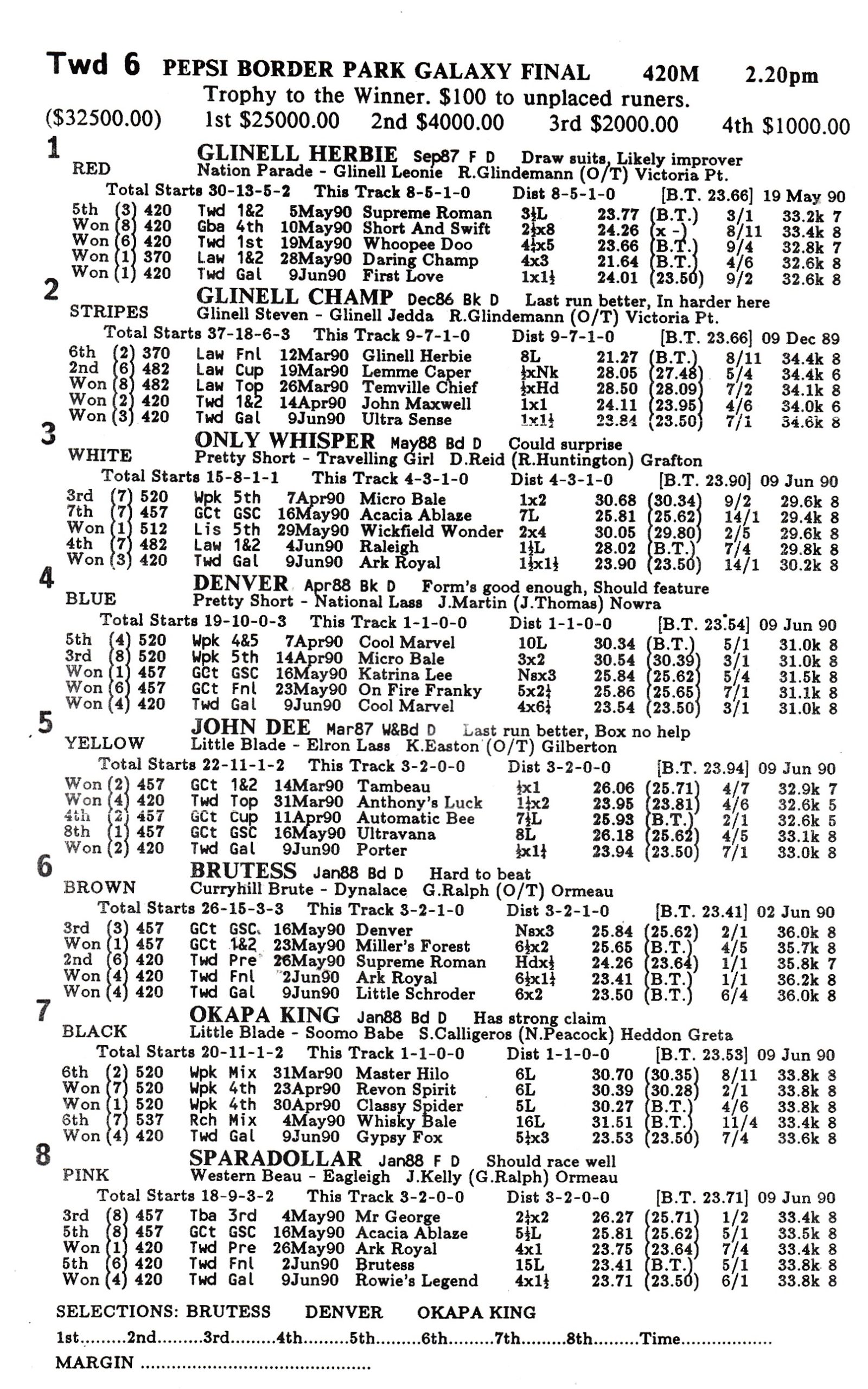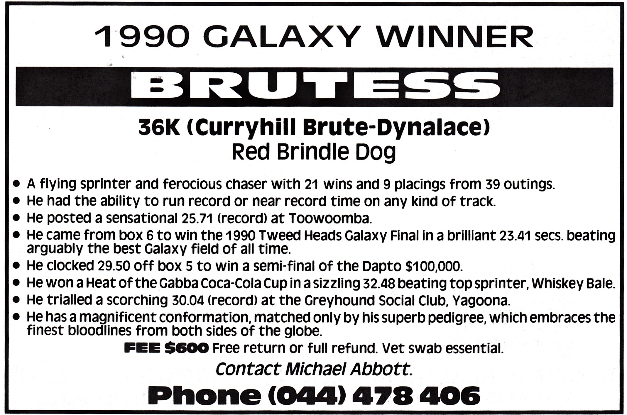 Top class performer Brutess for the late Gary Ralph. The original Galaxy program and Tuesday morning’s local newspaper report from one of my many visits to the Tweed for the Galaxy 1990.