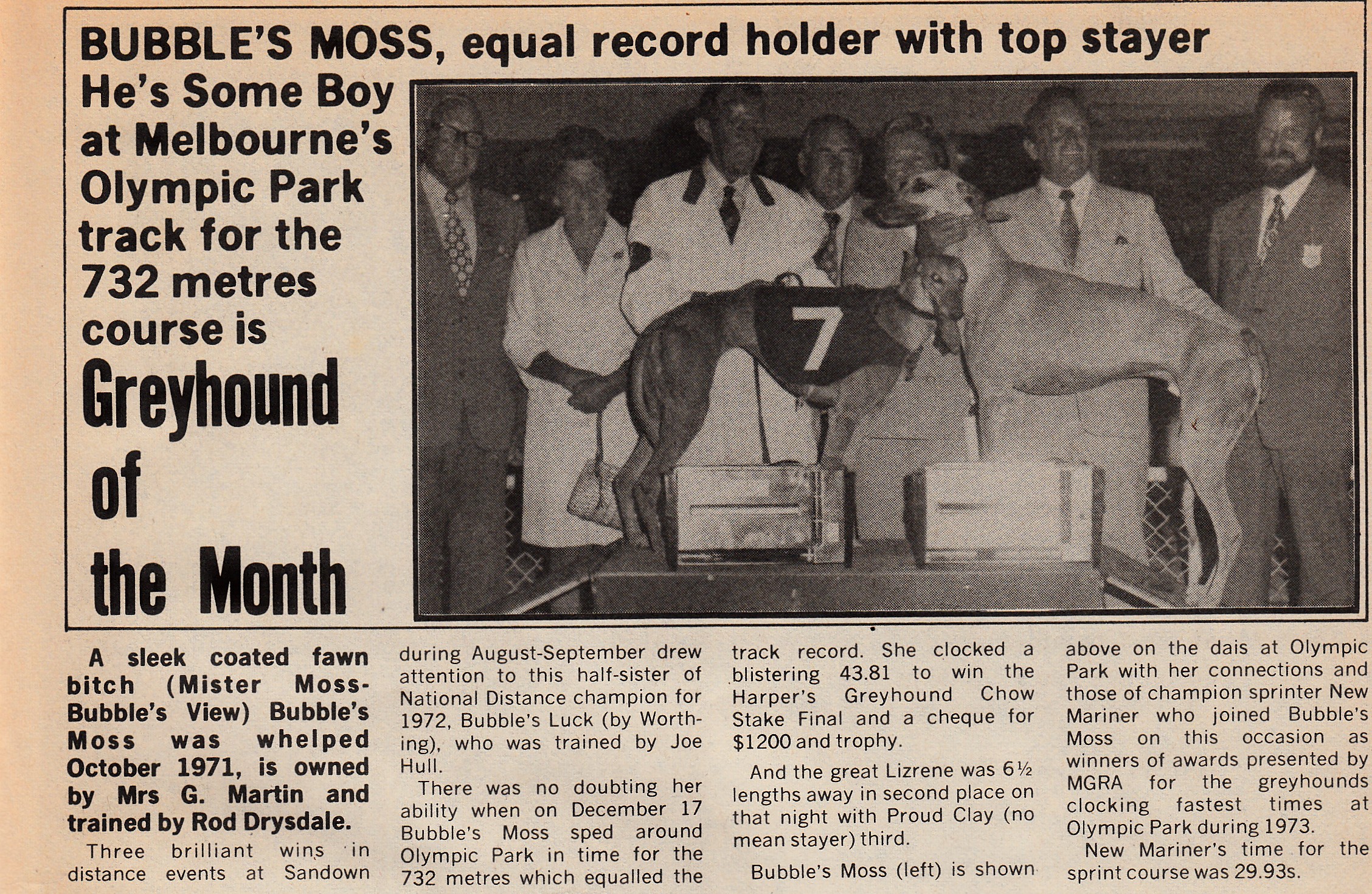 Champion stayer of her day Bubbles Moss. One of these pics has Phil Power presenting. Phil later became Chairman of the GRV in the 90’S and quite a good bloke.