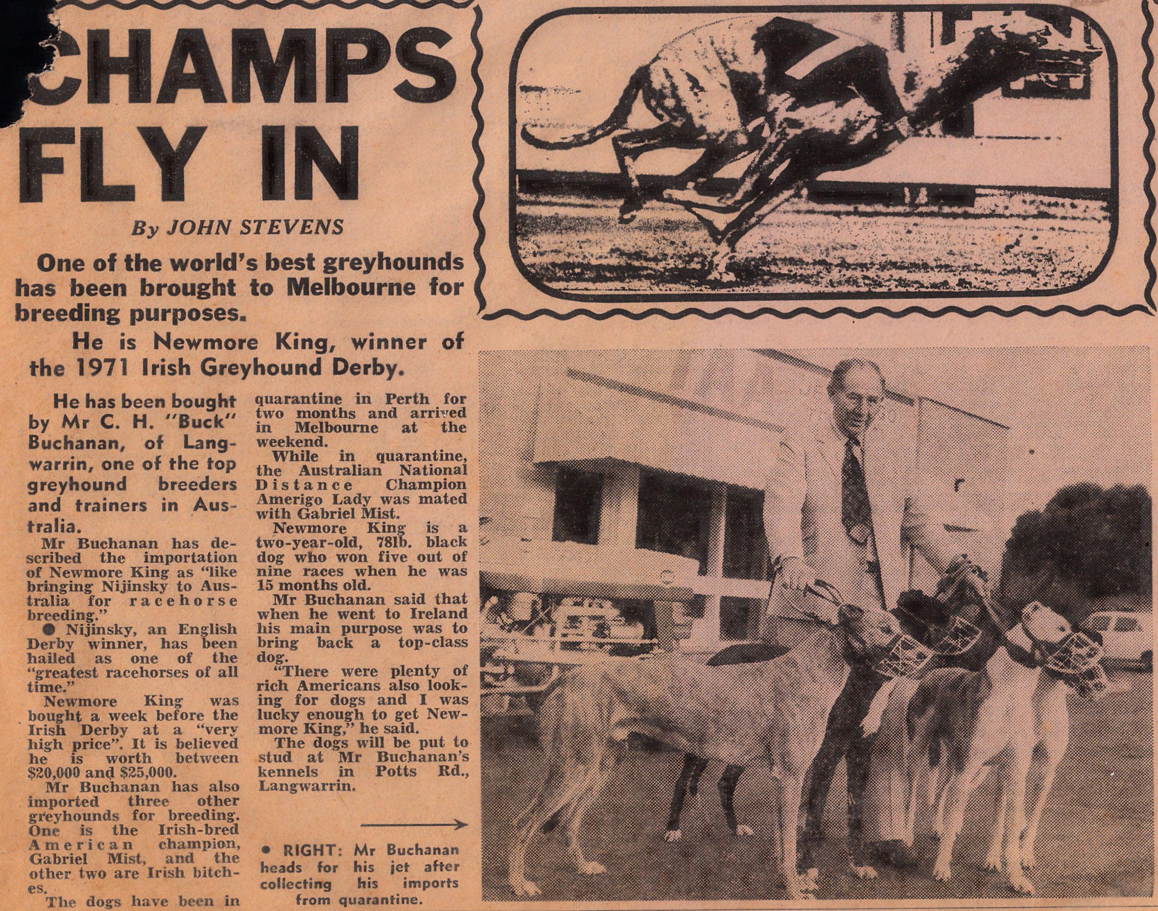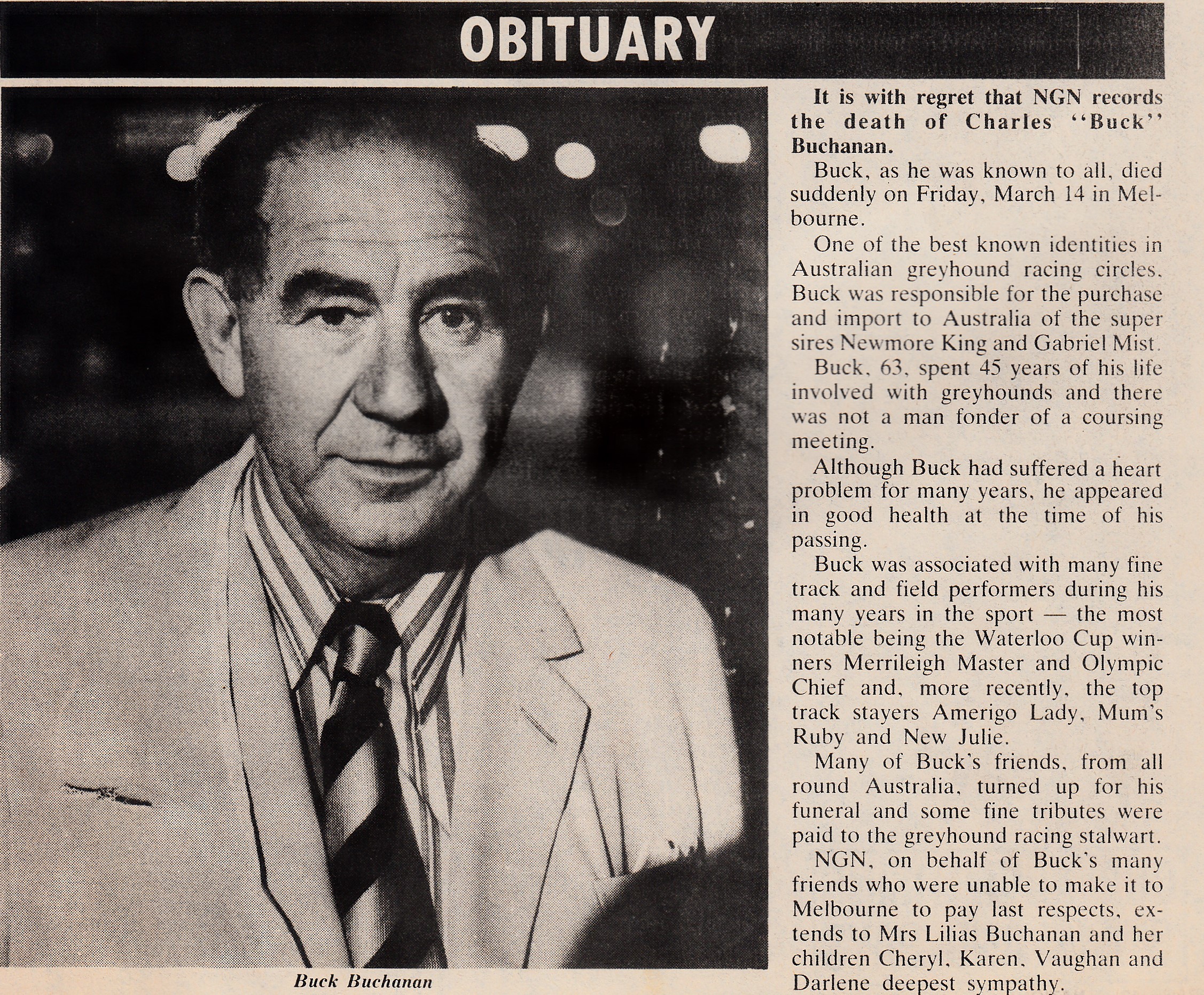 Jeff Collerson– I loved Buck. Thanks to him I met my wife to be Catherine in Paris in 1972 and in 2021 she remains the best winner I’ve ever backed, we have 4 kids & 2 grandchildren. Buck once imported a champion coursing bitch from Ireland called Killanahan who had never competed behind the mechanical lure. Crafty Buck set her for a maiden race up the straight at Wyong (NSW) where there were heaps of bookies and you could set for a stack. Because Killanahan had not won behind the mechanical lure she was eligible for a maiden race, despite being one of Ireland’s best coursing bitches. She bolted in and Buck destroyed the ring at Wyong! What memories.