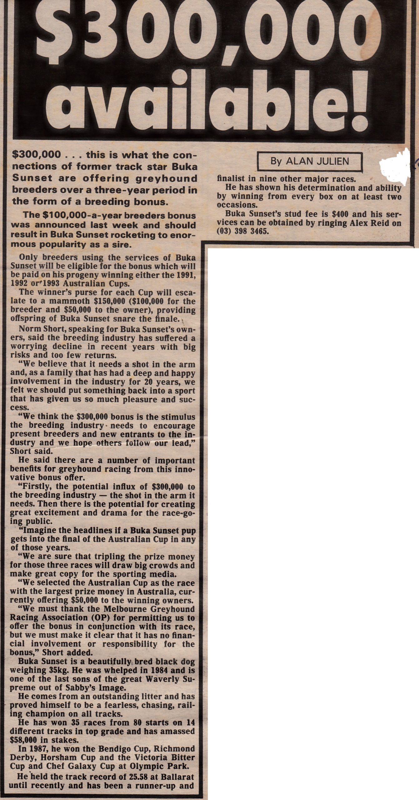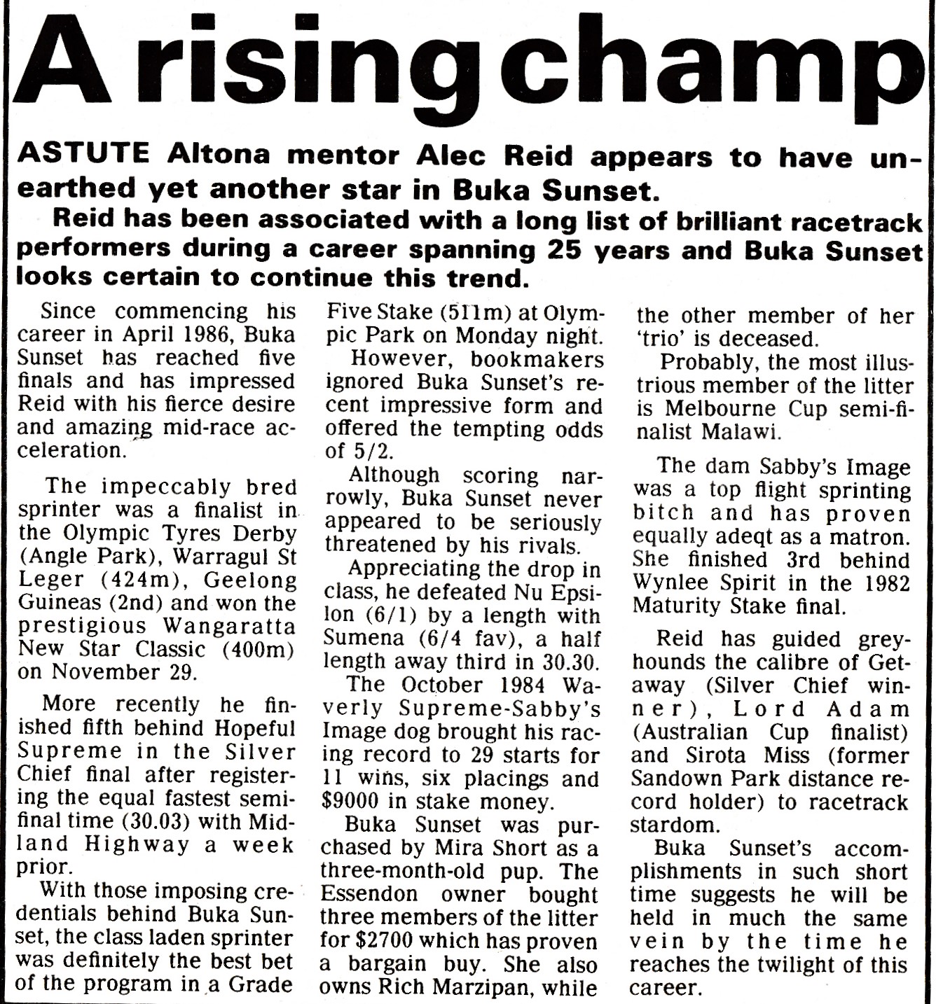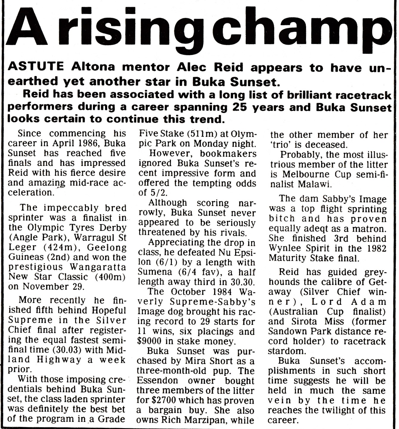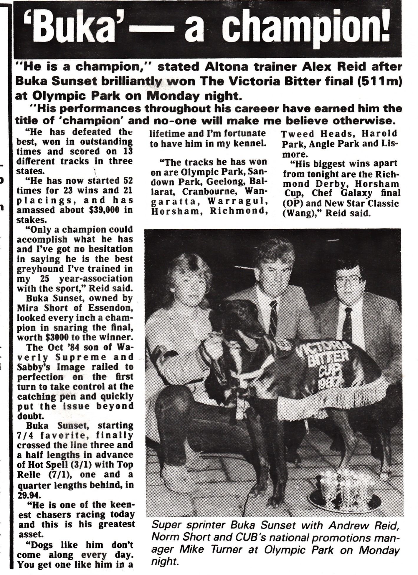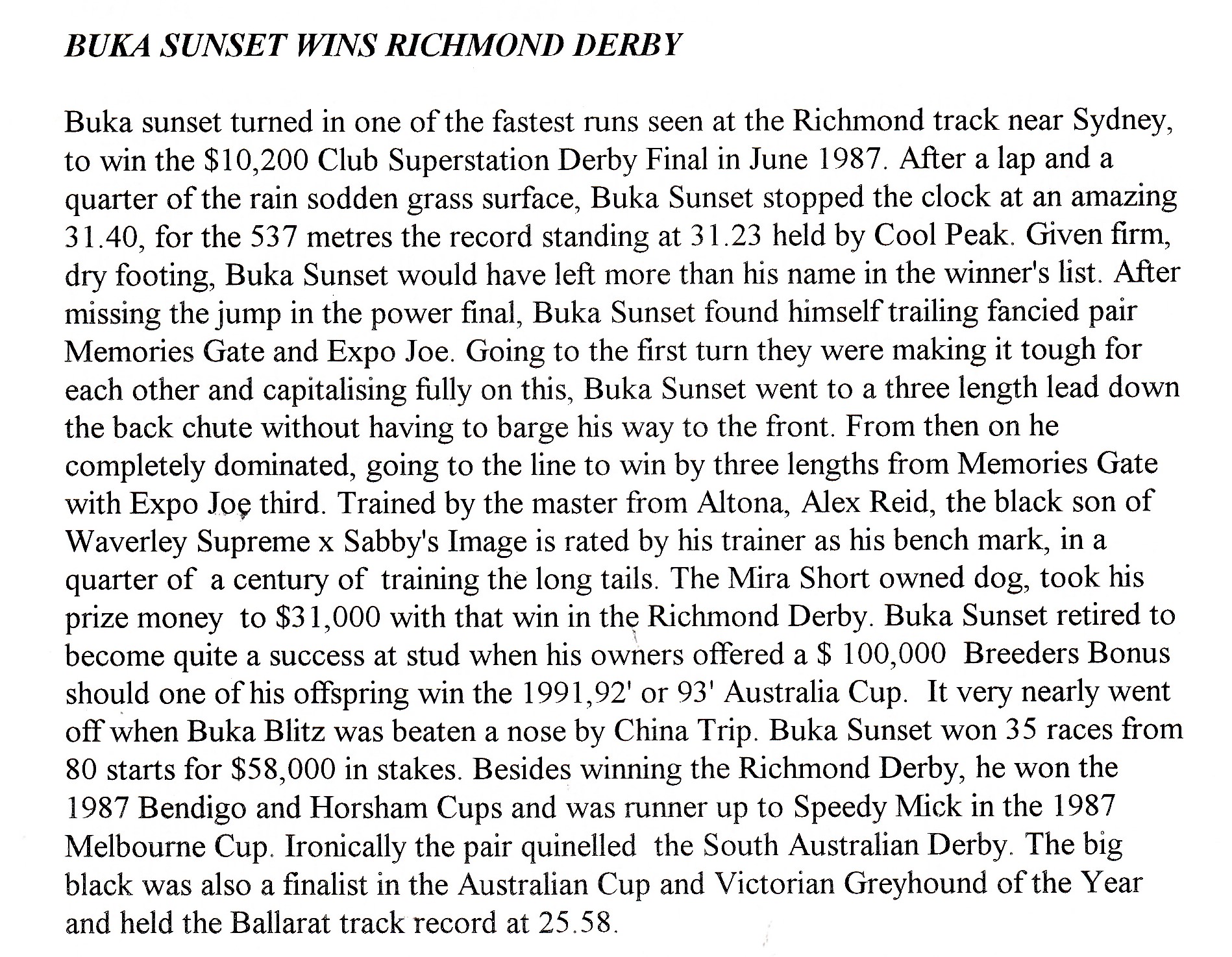 One of my all-time race favourites was the mighty Buka Sunset raced by Bookmaker Norm Short with his wife Mira. I recently bumped into Norm at the VBA Annual Dinner and we reminisced about the old days fondly remembering our great mate the one and only Hall of Famer the late Alec Reid. Norm bred and raced plenty of good ones all trained by the master. Alec always claimed Buka Sunset was his best which was claim no one would question. I reminded Norm of his Stud Promotion and how unique it was. Norm put up $100,000 Bonus if any of Buka Sunset’s progeny could win the 1991,92 or 1993 Australian Cup. In 1992 it almost happened when Buka Blitz came from behind and got to within a Head of the brilliant China Trip in the first of her two Cup wins. Here is a report I wrote with Buka Sunset’s stats and some pics and reports of the champ.
