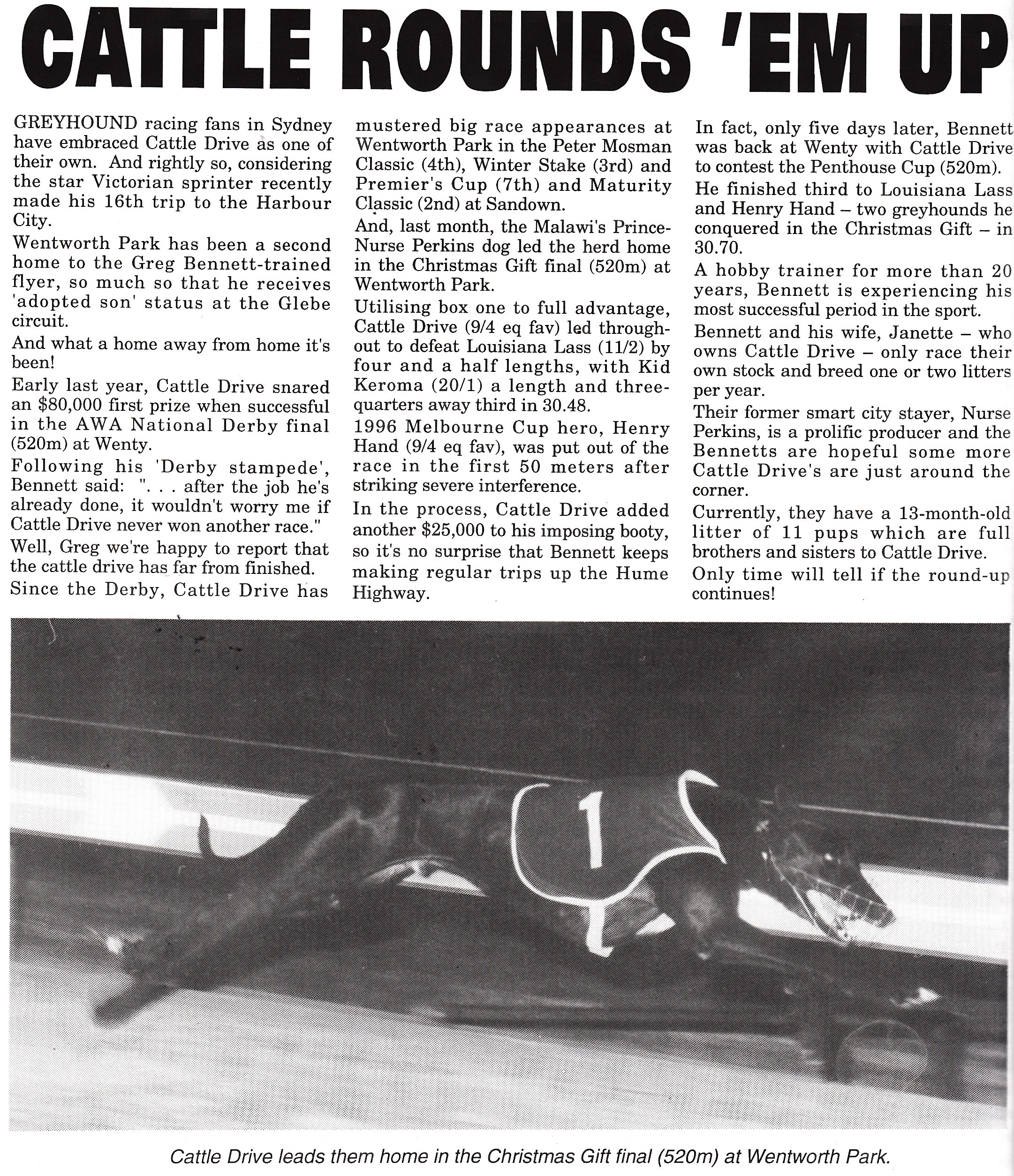 Some dogs race extremely well away from home. One such chaser was Cattle Drive he raced at Wentworth Park on many occasions. Always in top company he won the 1996 National Derby and Christmas Gift. He was raced by Greg Bennett from Devon Meadows. He also won at Sandown, Olympic Park, Cranbourne and Traralgon.